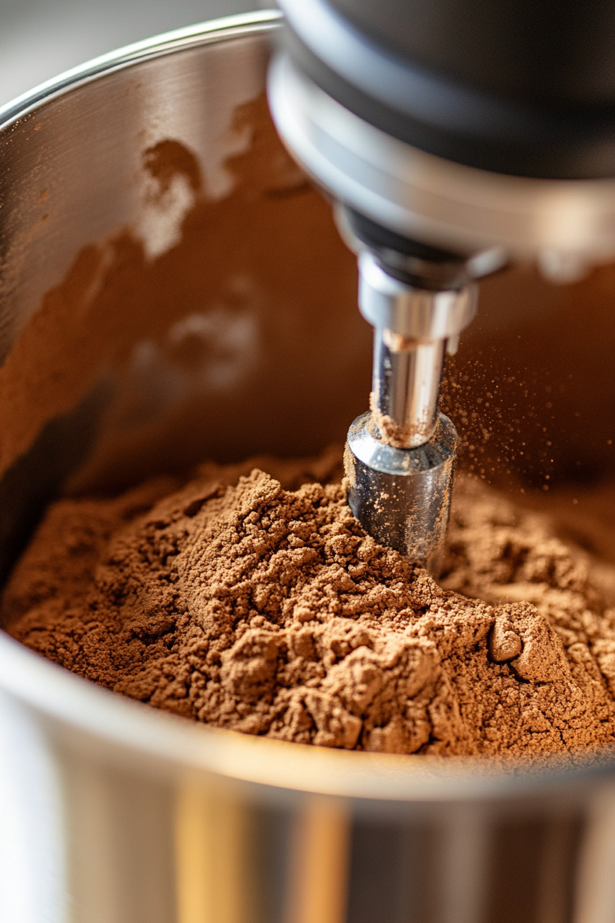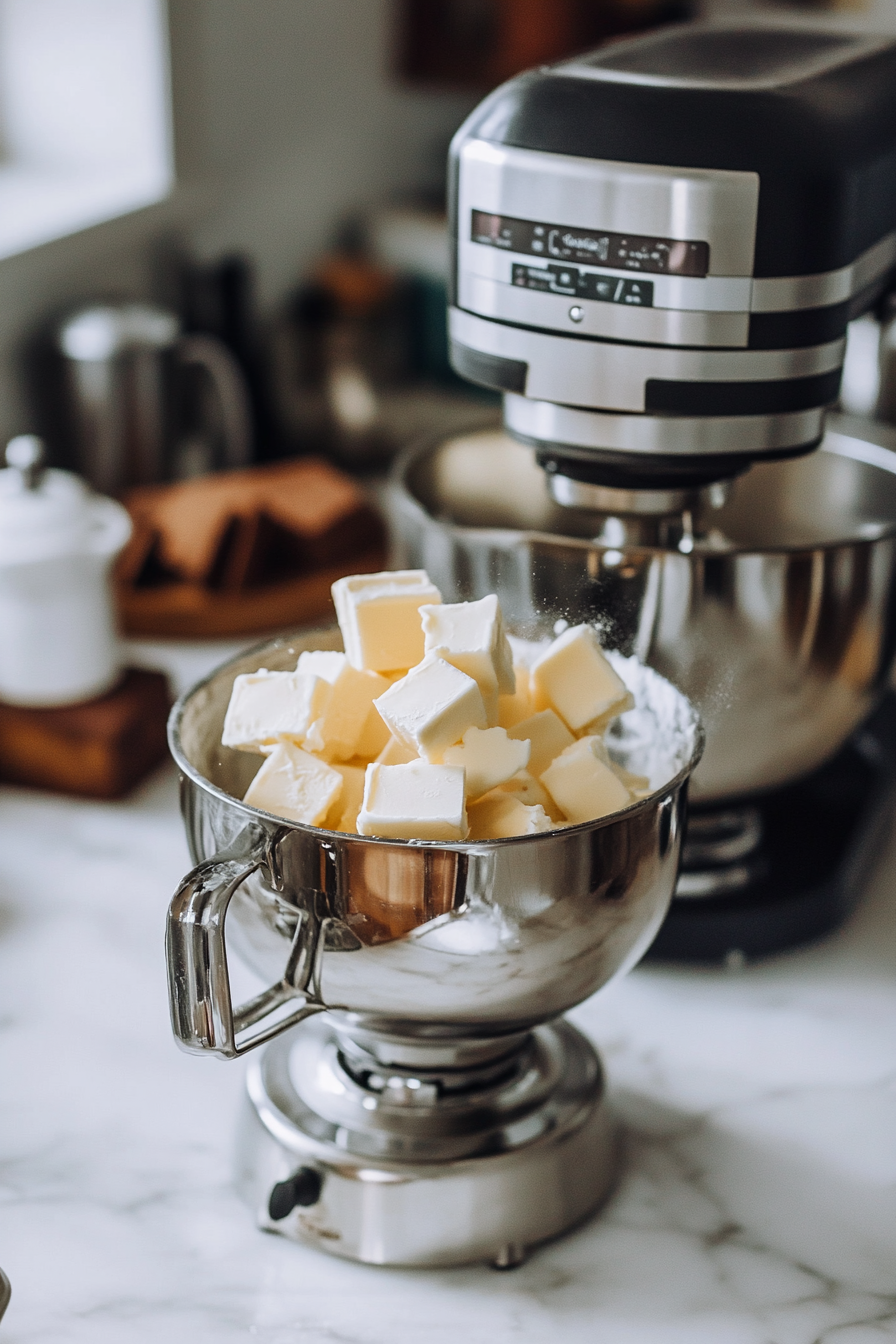 In a stand mixer, cream cold cubed butter and brown sugar on low, increasing to medium speed for 3-4 minutes.