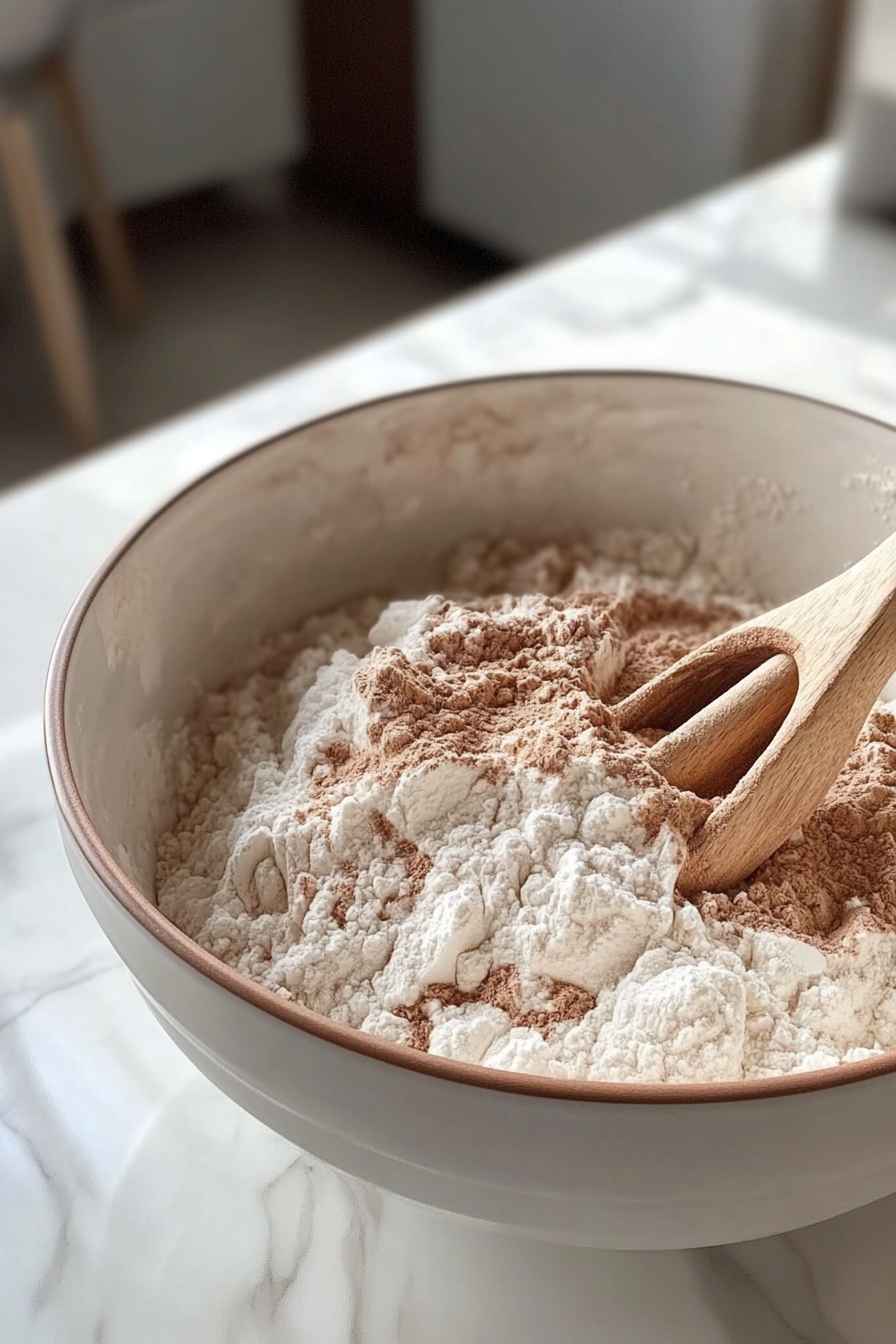 In a large bowl, whisk together flour, salt, baking soda, baking powder, and cinnamon. Set aside.