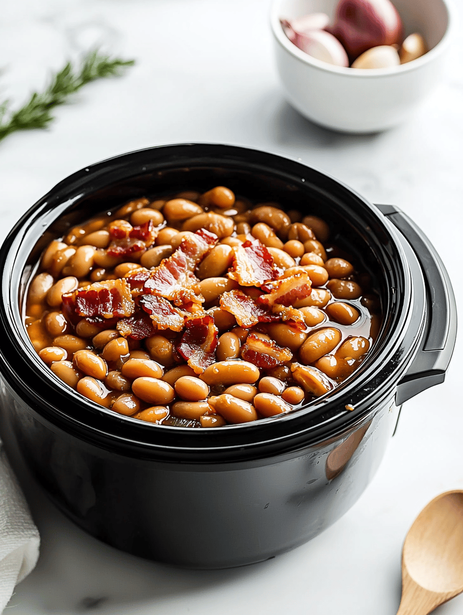 Cover the slow cooker with the lid and set it to low heat. Let the beans cook slowly for about 6 hours, until they are tender and start to caramelize around the edges.