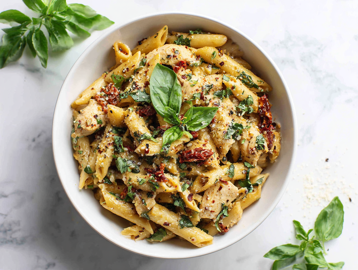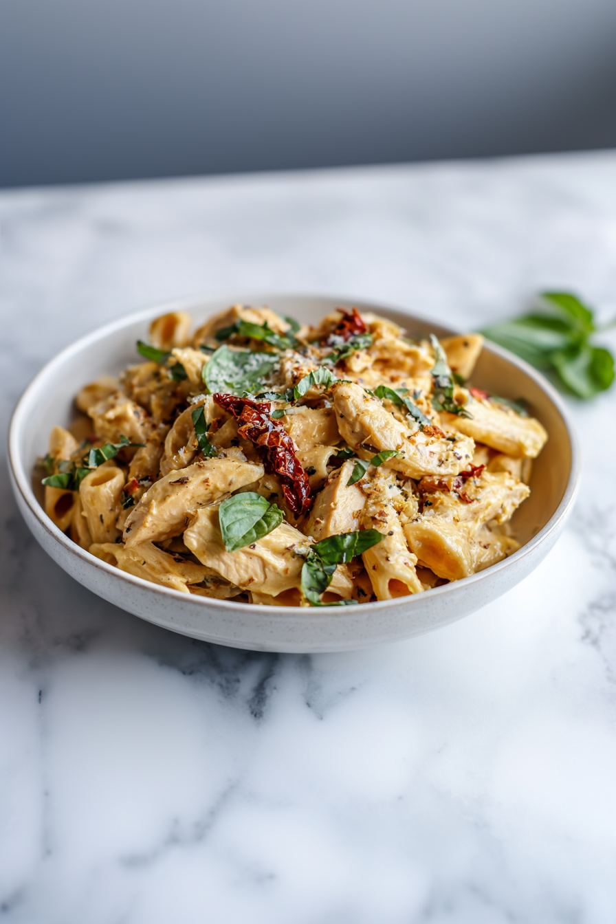 Add cooked chicken and pasta back into the sauce. Toss to coat evenly.