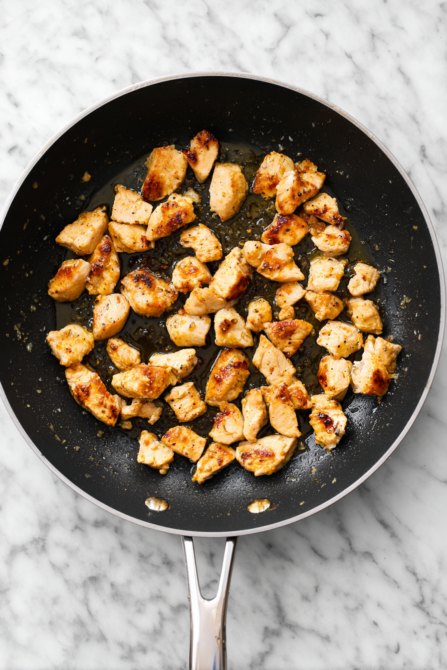 Season chicken with salt and pepper. Sauté in olive oil until golden and cooked through. Remove from pan.