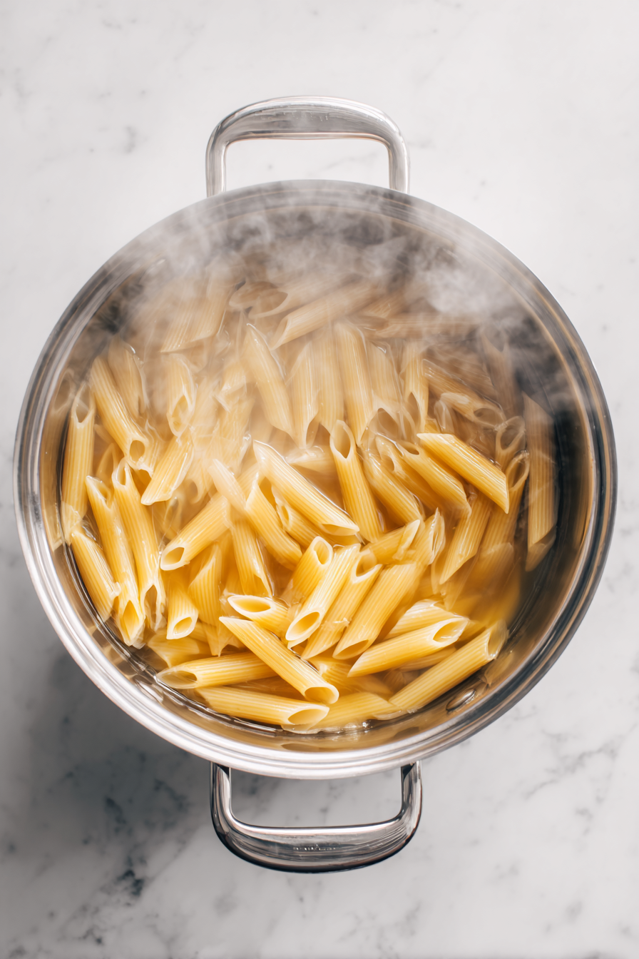 Cook penne pasta in salted water according to package directions. Drain and set aside.
