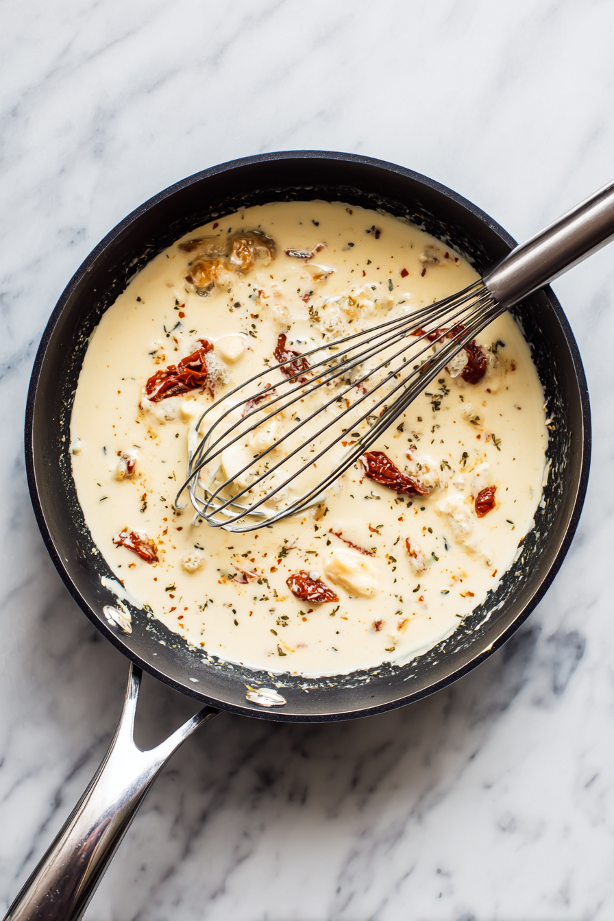 Slowly pour in chicken broth, whisking constantly. Add heavy cream and bring to a gentle simmer.
