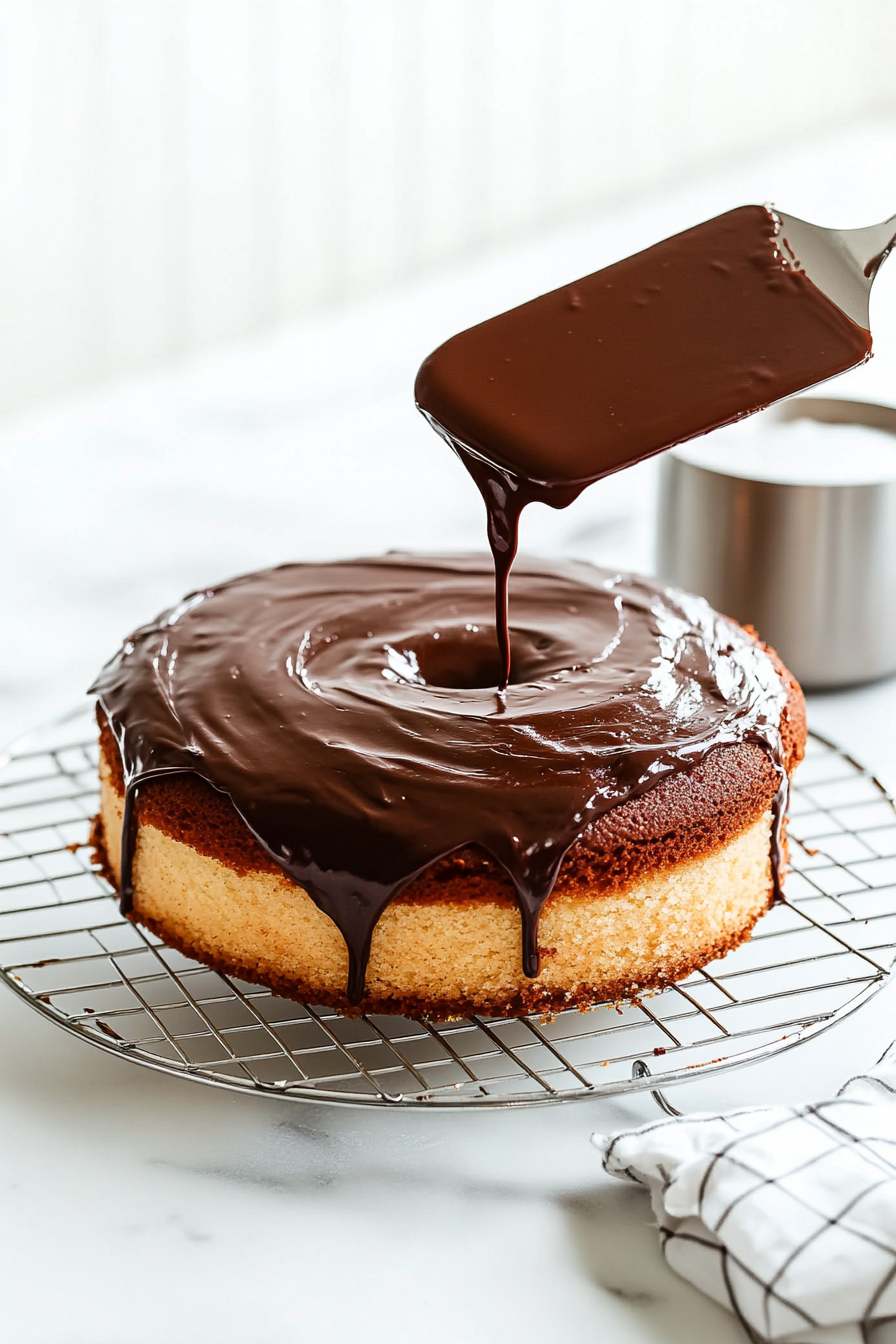 Place the chilled cake on a wire rack over a baking pan.Microwave reserved icing in intervals until smooth and pourable (60 to 90 seconds).Pour icing over the cake in a steady stream, starting at the center and moving to the edges.Smooth out the sides and fill any gaps with an offset spatula.