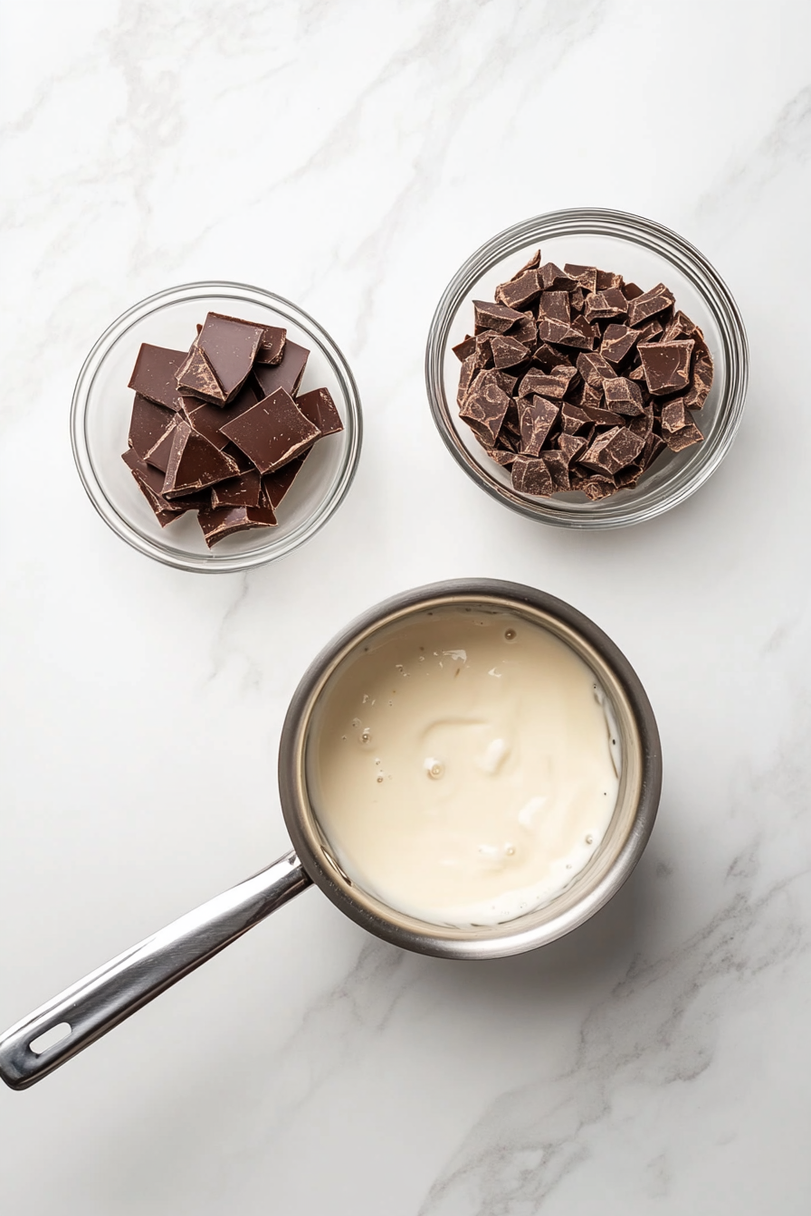 Combine cream and corn syrup in a saucepan over medium heat until it simmers.Pour the hot mixture over chocolate in a microwave-safe bowl, add salt, and let it sit for 2 minutes.