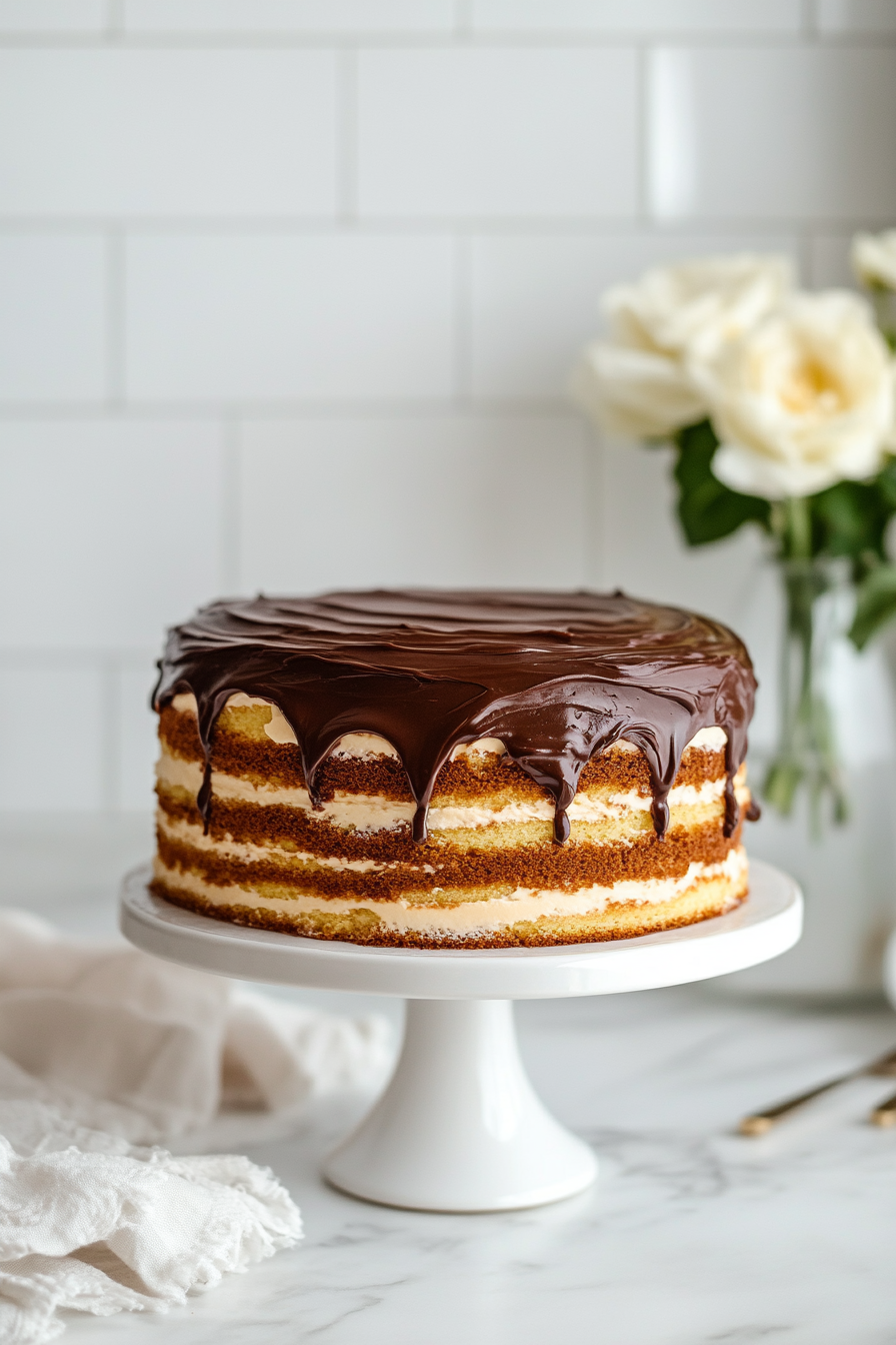 Place 1 cake layer on an 8-inch round cake board and spread with 1/3 cup icing. Top with another layer and repeat with remaining layers and icing. Coat the top and sides of the cake with a thin layer of icing. Chill the cake in the refrigerator for 1 hour.