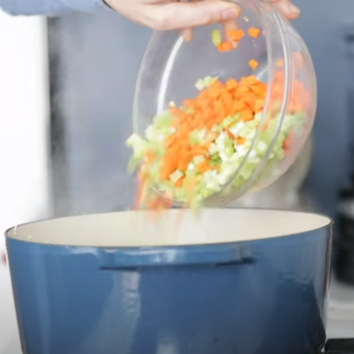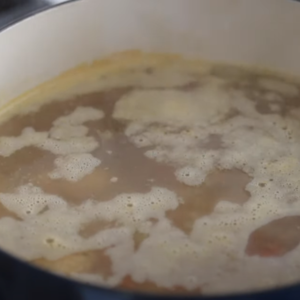 While the matzo balls are cooking, prepare the soup base by simmering chicken broth with vegetables.