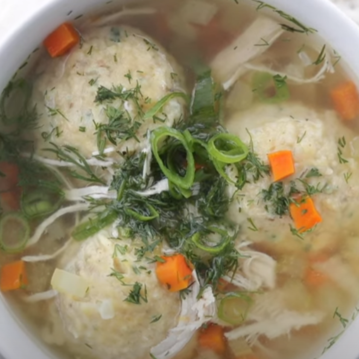 Once the matzo balls are cooked and the soup is ready, ladle the soup into bowls.