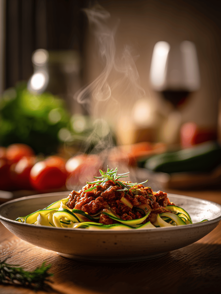 Serve the zucchini Bolognese over your favorite cooked pasta or roasted vegetables. Garnish with extra basil or cheese if desired, and enjoy the glossy, smoky, comforting dish.