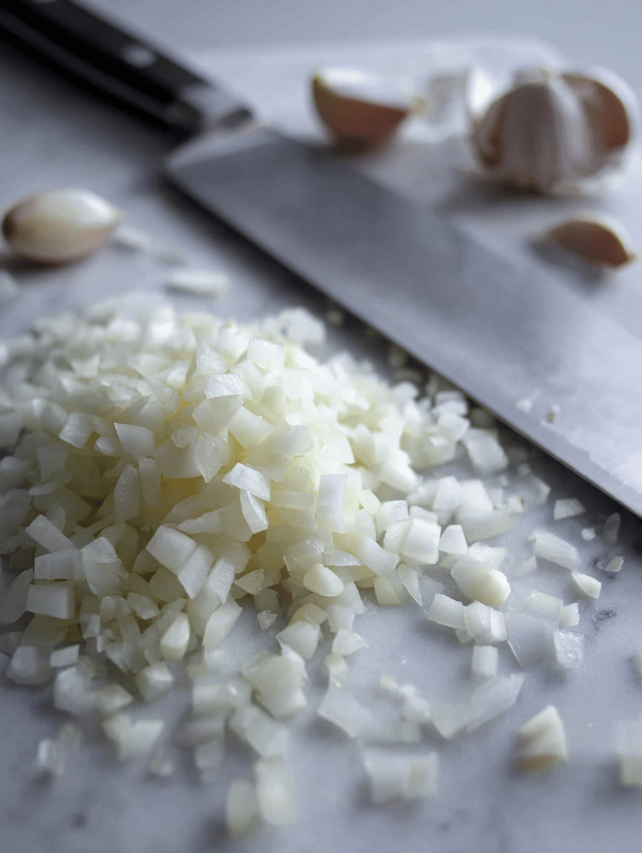 Chop the onion into small, even pieces and mince the garlic cloves. Set aside.