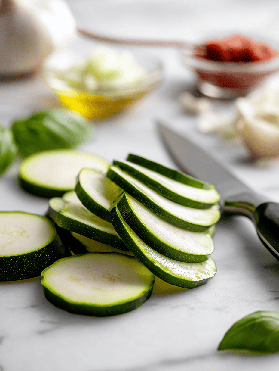 Using a sharp knife, slice the zucchini into thin rounds or half-moons, aiming for uniform thickness so they cook evenly.