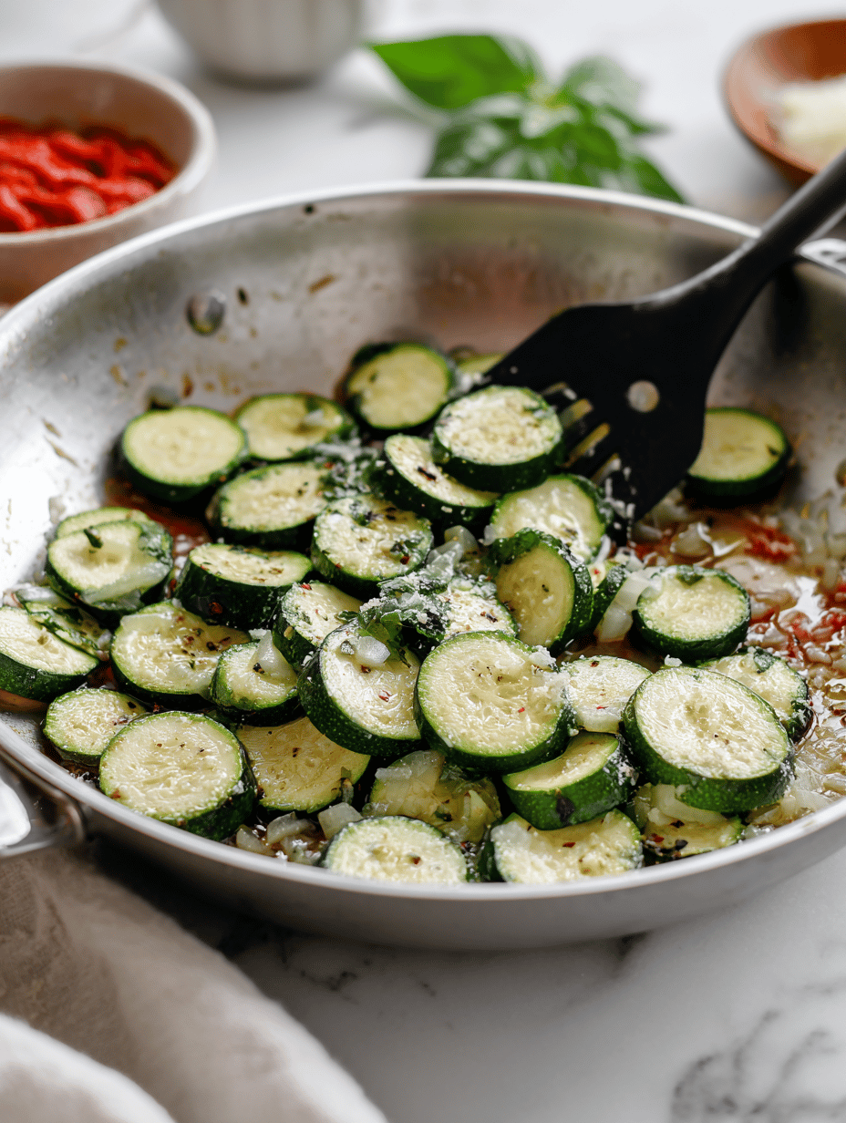 Add the sliced zucchini to the pan, stirring well to coat with the aromatics. Cook for 8-10 minutes, stirring occasionally, until the zucchini softens and begins to turn golden around the edges.