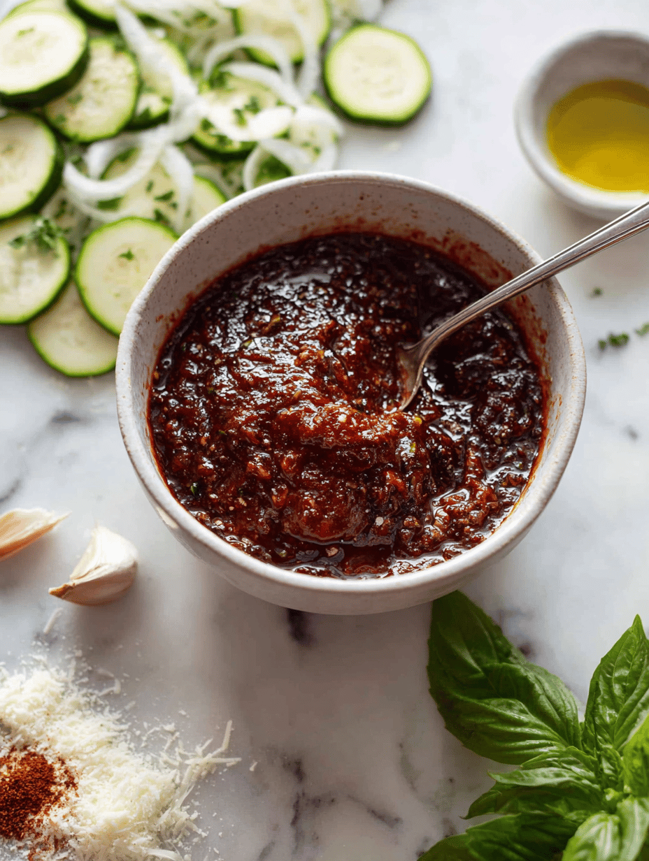 This zucchini Bolognese transforms humble zucchini into a glossy, smoky, and savory sauce that clings to pasta beautifully. It uses simple ingredients like onion, garlic, tomato paste, and fresh herbs to create a rich, elegant vegetarian dish with a satisfying final texture. The sauce bubbles and thickens to a luscious consistency, offering a comforting yet refined meal.
