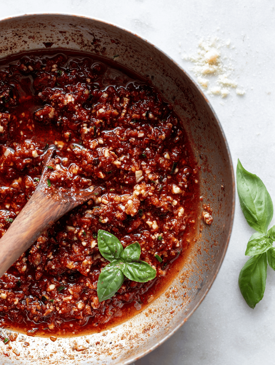 Chop fresh basil leaves and stir them into the sauce, along with grated parmesan cheese or nutritional yeast if desired. Taste and adjust the seasonings with salt if needed.