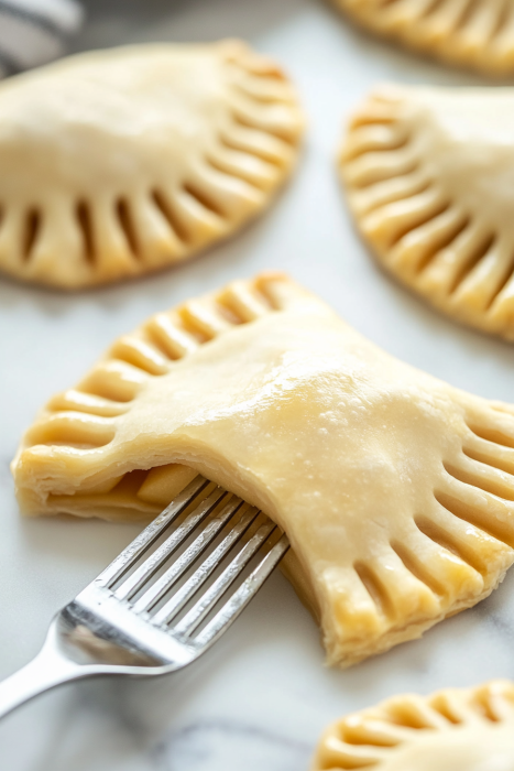 Soften the ApplesMelt butter in a skillet and add the apples, brown sugar, cinnamon, nutmeg, lemon juice, and salt. The apples soften after a few minutes and the kitchen starts smelling sweet and warm. Let the Filling CoolSet the mixture aside to cool slightly warm filling can make the dough tear. Roll the DoughRoll out the pie dough to make it a bit thinner and cut it into circles or rectangles. Add the FillingSpoon a small amount of apple filling onto each piece, leaving space around the edges. Fold and SealFold the dough, press the edges together with a fork, and make small vents on top to let steam escape. Brush and SprinkleBrush each hand pie with egg wash and sprinkle a little sugar over the top. Bake Until GoldenBake at 400°F for 15–18 minutes until the crust turns golden and crisp. Cool Before ServingLet the pies cool for a few minutes, the filling settles and the crust stays flaky.