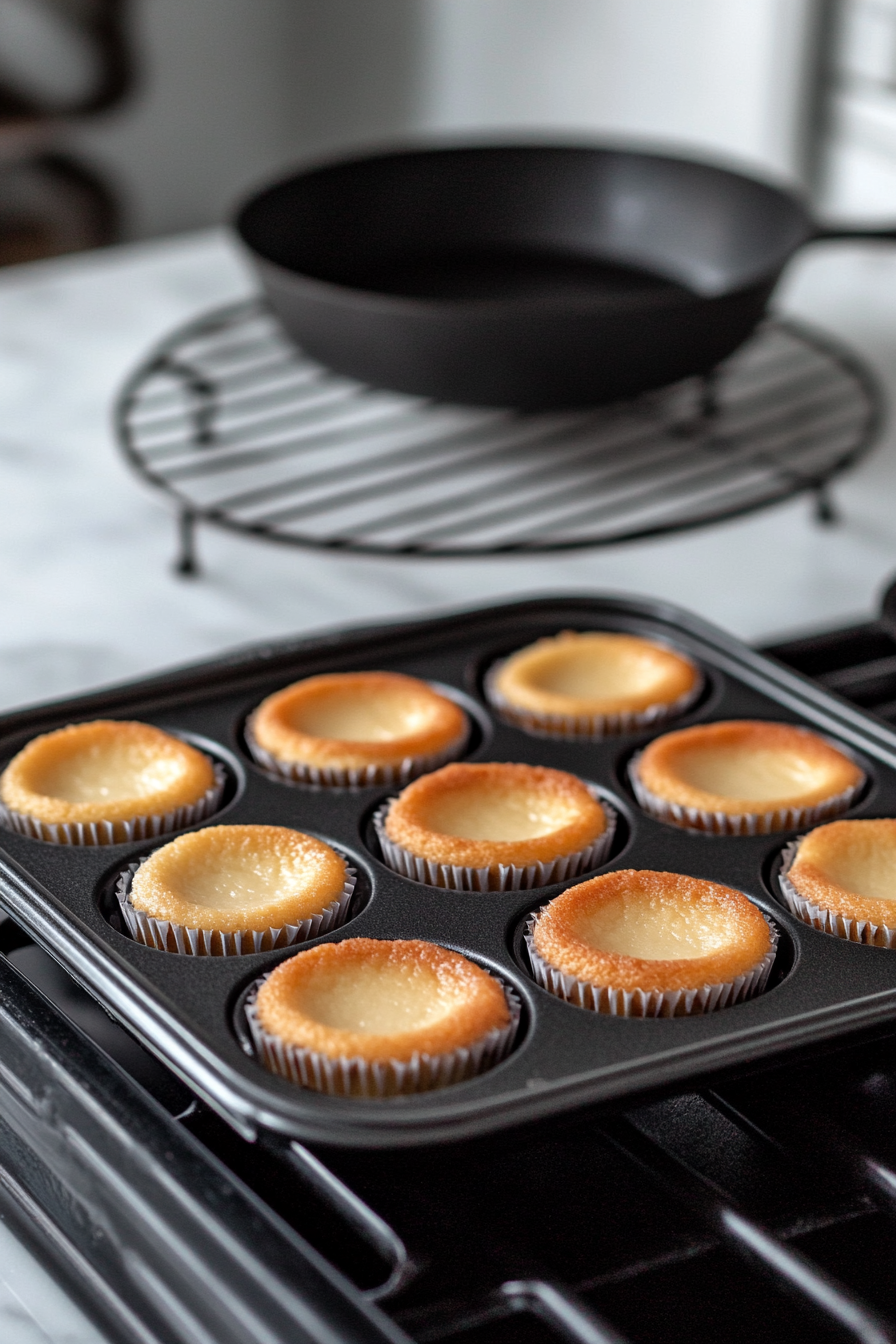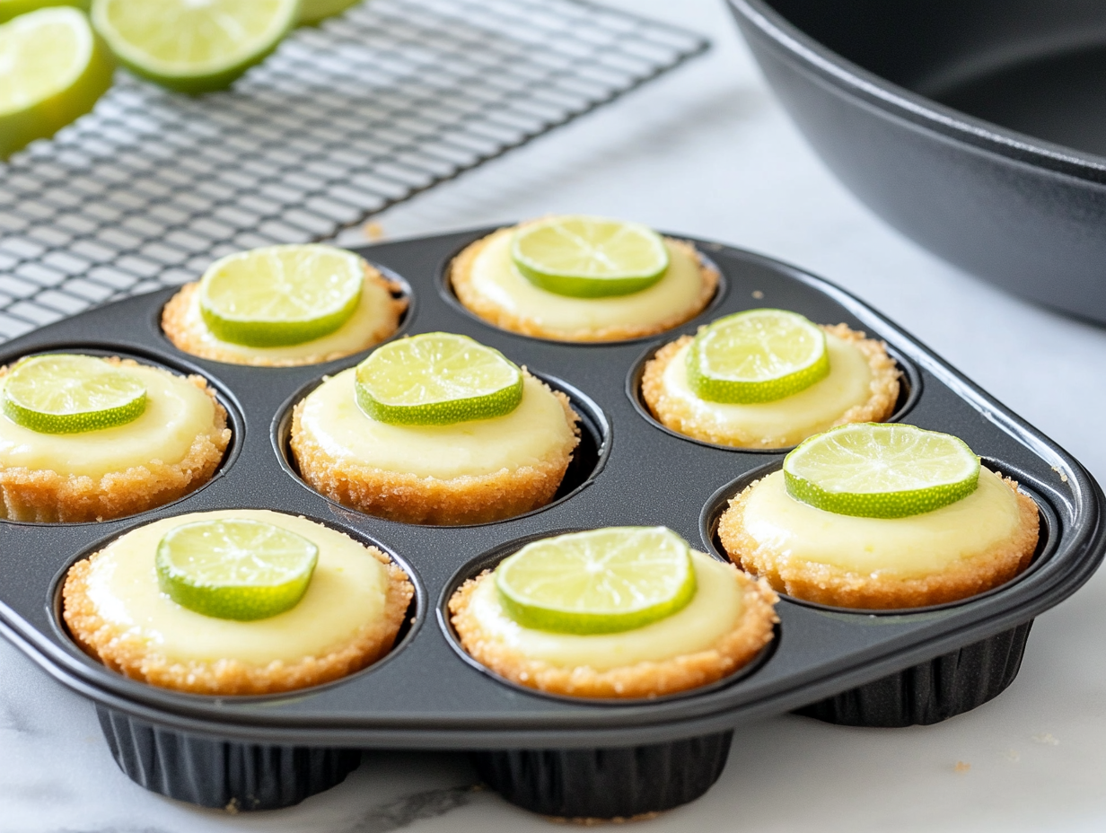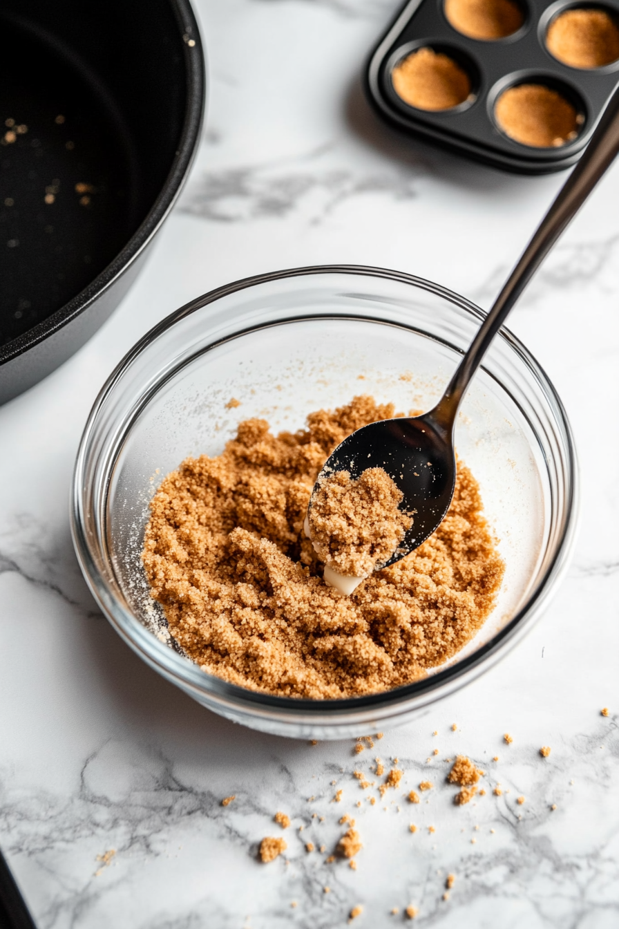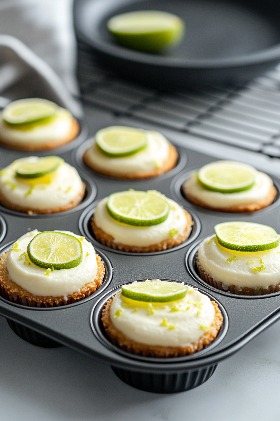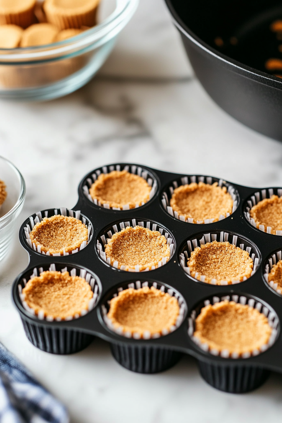 Mix graham cracker crumbs, butter, and sugar. Add 1 tablespoon of the mixture to each muffin cup and press down. Bake for 5 minutes and set aside.