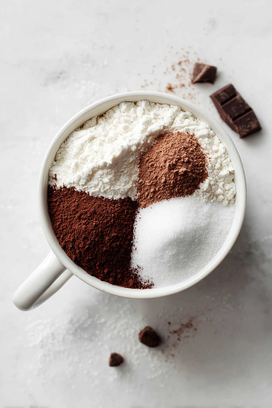 In a microwave-safe mug, add flour, sugar, cocoa powder, baking soda, and salt. Mix well.