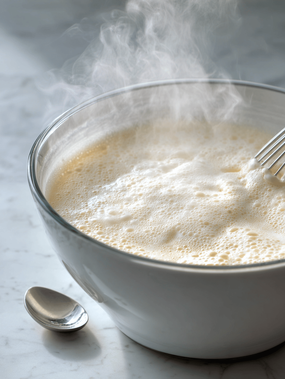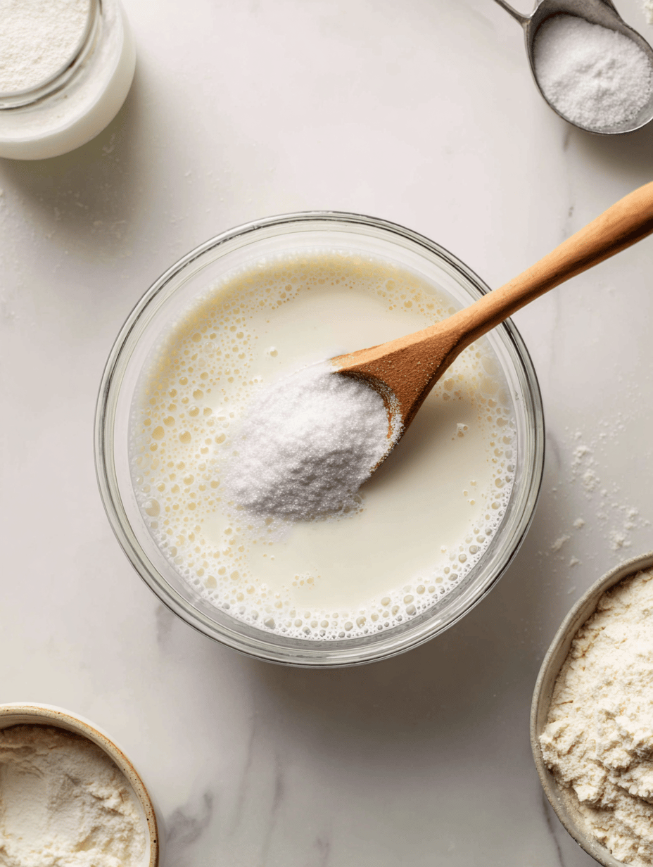 Add a teaspoon of sugar and the yeast to the warm milk, gently stir, and let sit until frothy, about 5-8 minutes. You’ll see bubbles and a foamy top indicating activation.