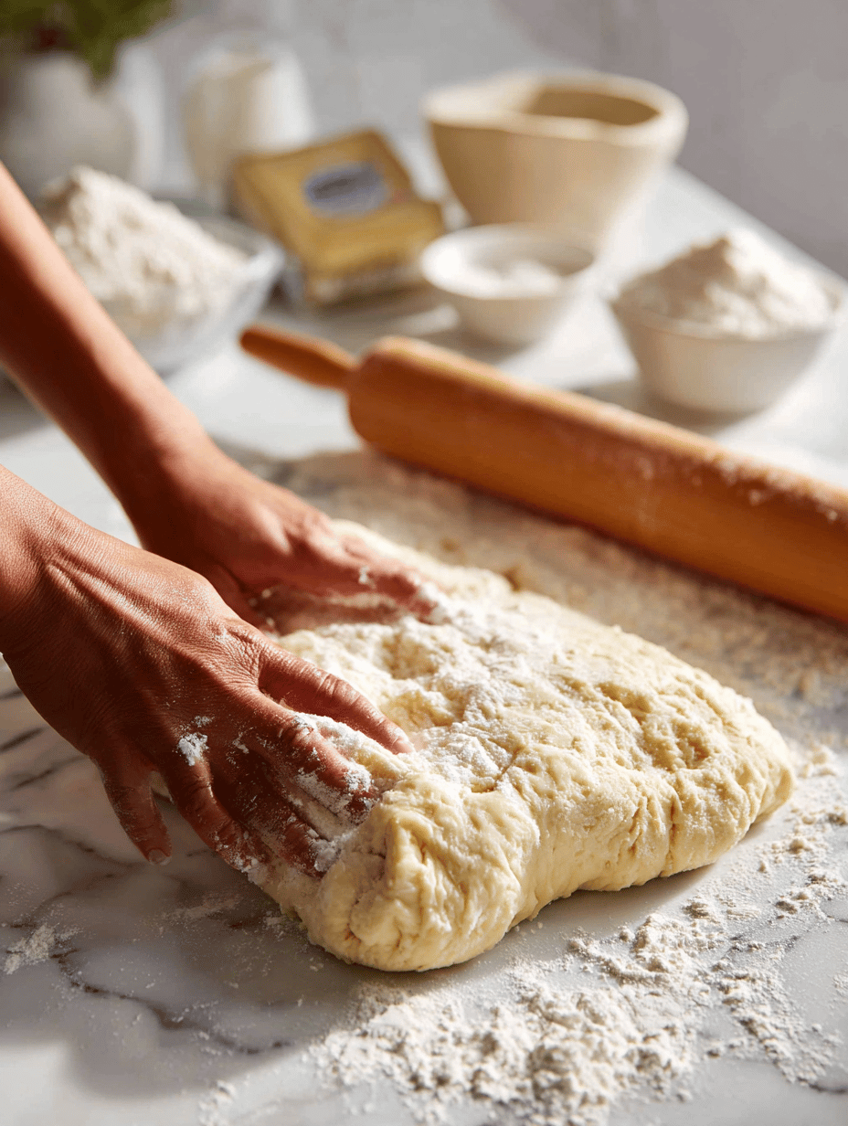 Once risen, punch down the dough gently and turn it onto a floured surface. Roll it out into a rectangle about 12x16 inches with a rolling pin.