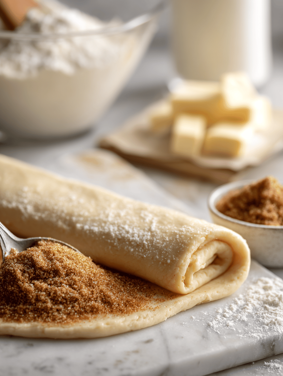 Spread the cinnamon-sugar filling evenly over the rolled-out dough, leaving a small border around the edges.