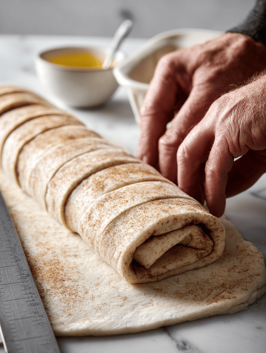 Carefully roll the dough tightly from the long side into a log. Slice into 8 equal pieces and arrange them in a greased 9x13 inch baking dish, spacing slightly apart.