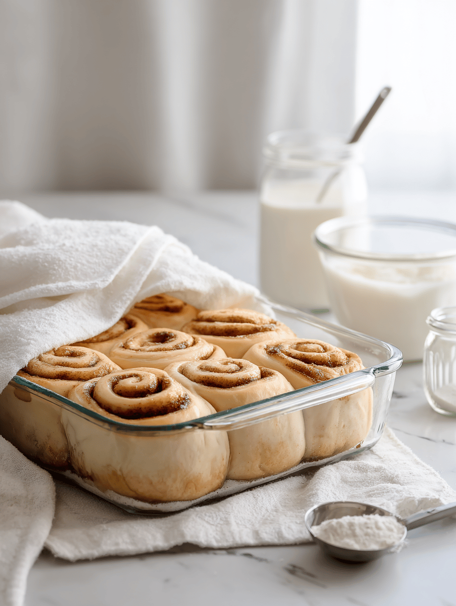 Cover the baking dish with a clean towel and let the rolls rise again until they puff up, about 30-45 minutes.
