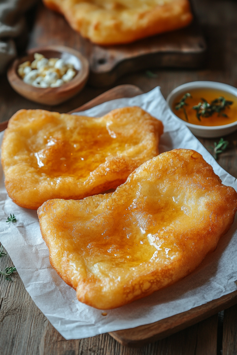 Fry Until GoldenCarefully lay one round of dough in the oil. It should puff immediately. Fry for about 1 minute on each side, until golden brown and crisp.