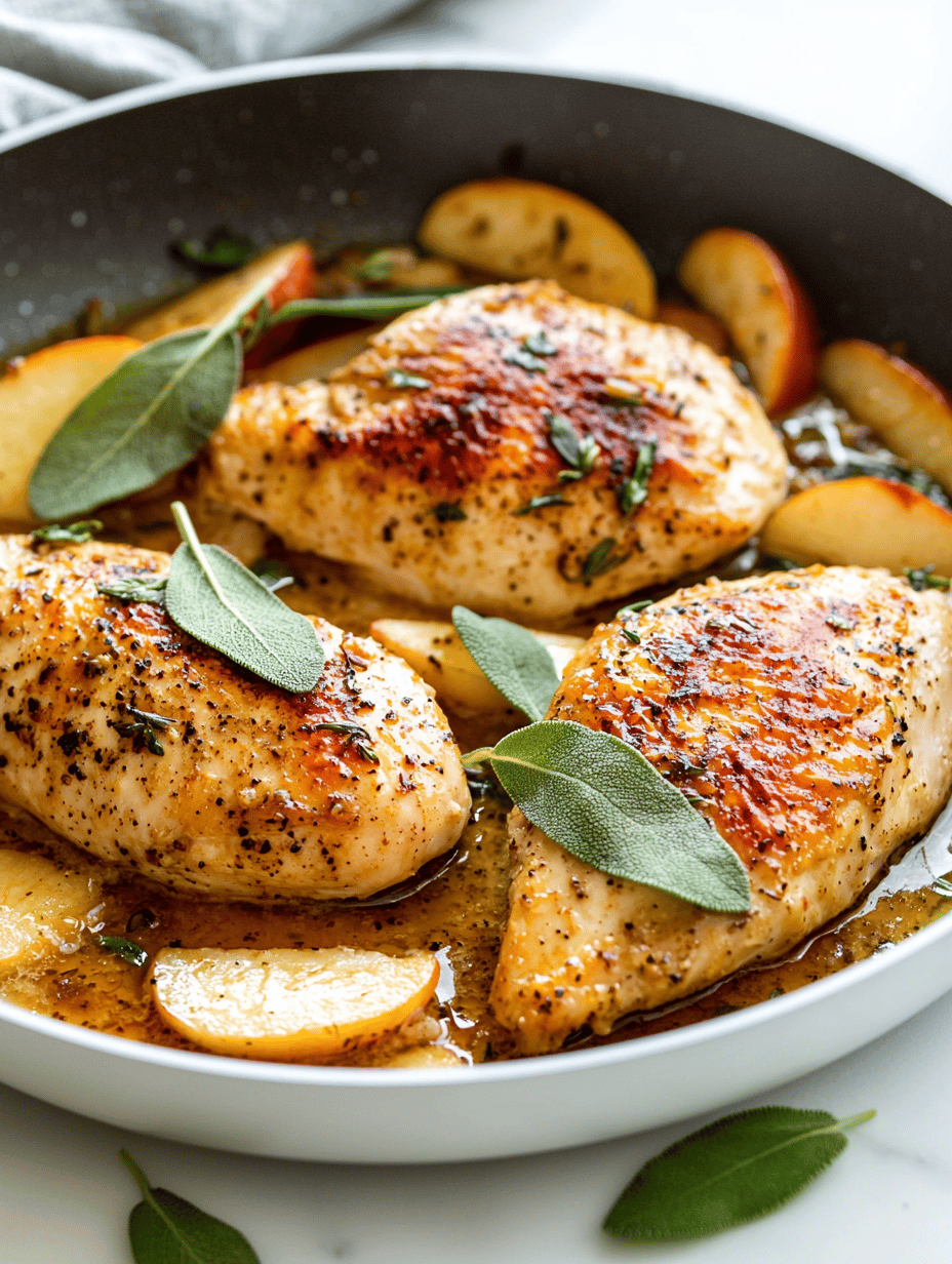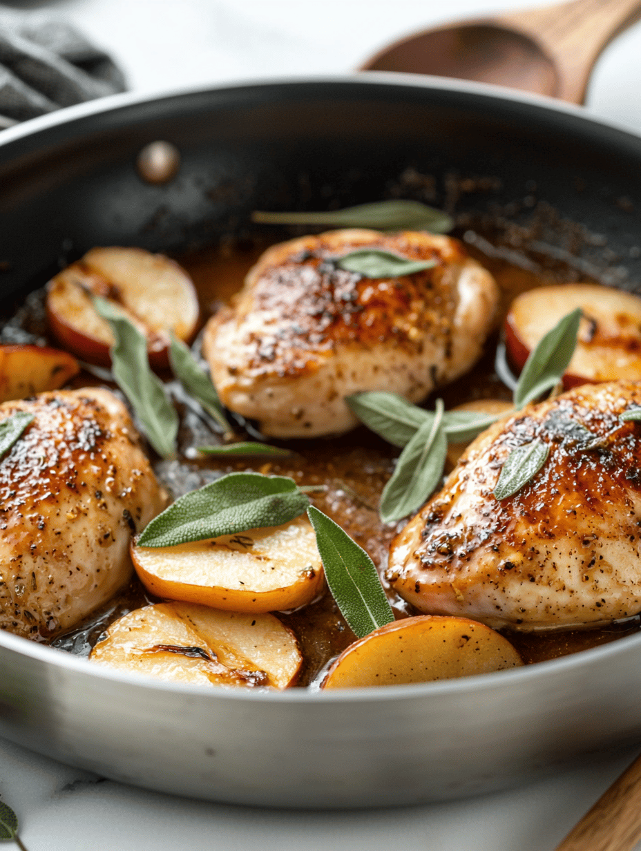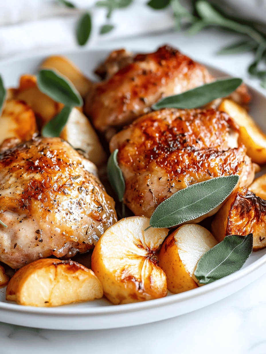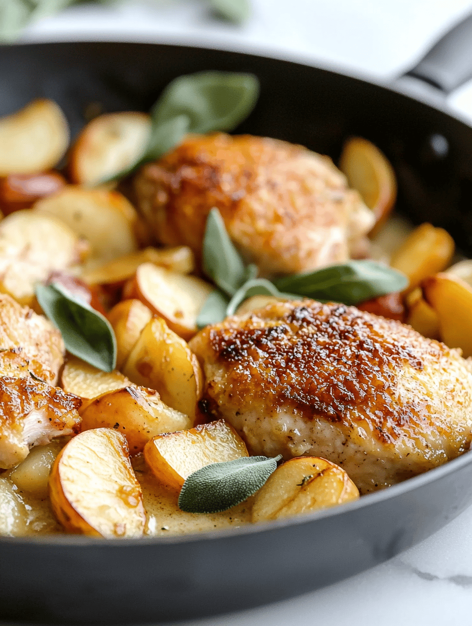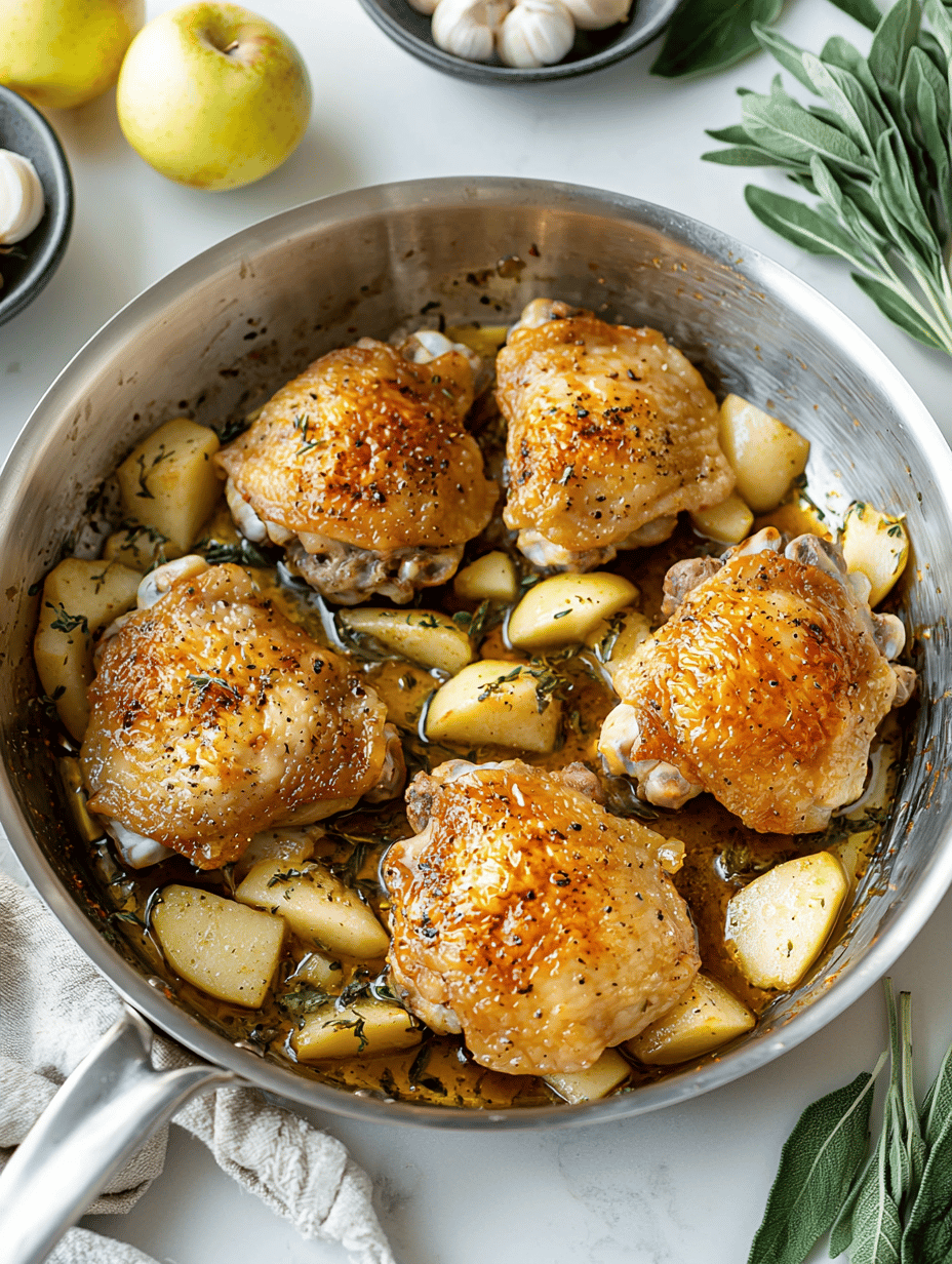 This dish features bone-in chicken thighs roasted in a skillet alongside sweet apples and fragrant sage. The chicken develops a crispy skin, while the apples caramelize to a tender, syrupy consistency, creating a rustic and comforting main course with rich aromas and a golden appearance.