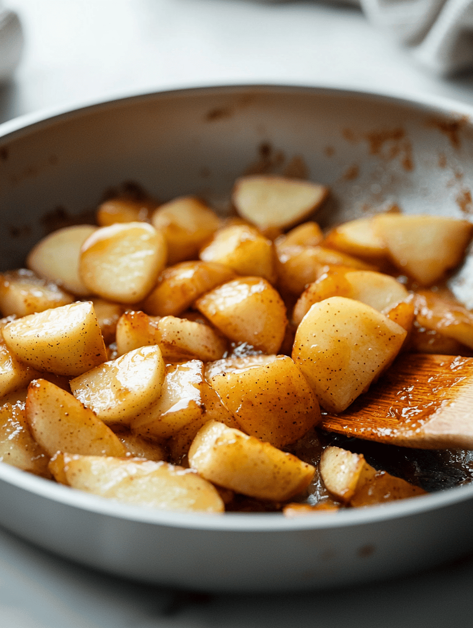 Add the apple slices to the skillet and cook over medium heat for about 8-10 minutes, stirring occasionally, until they soften and develop caramelized edges, filling the kitchen with sweet, toasty aromas.