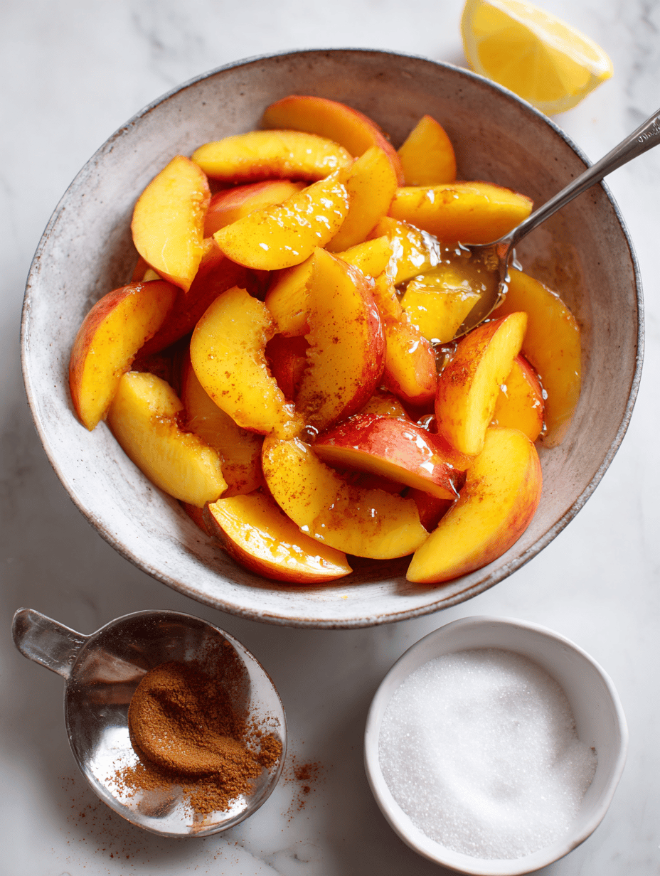 Preheat your oven to 190°C (375°F) and lightly grease your 9-inch baking dish. Peel the peaches if desired, then slice them into 1/4-inch thick pieces. Toss the peach slices with lemon juice, 1/4 cup sugar, and a pinch of cinnamon, then set aside to let the flavors meld.