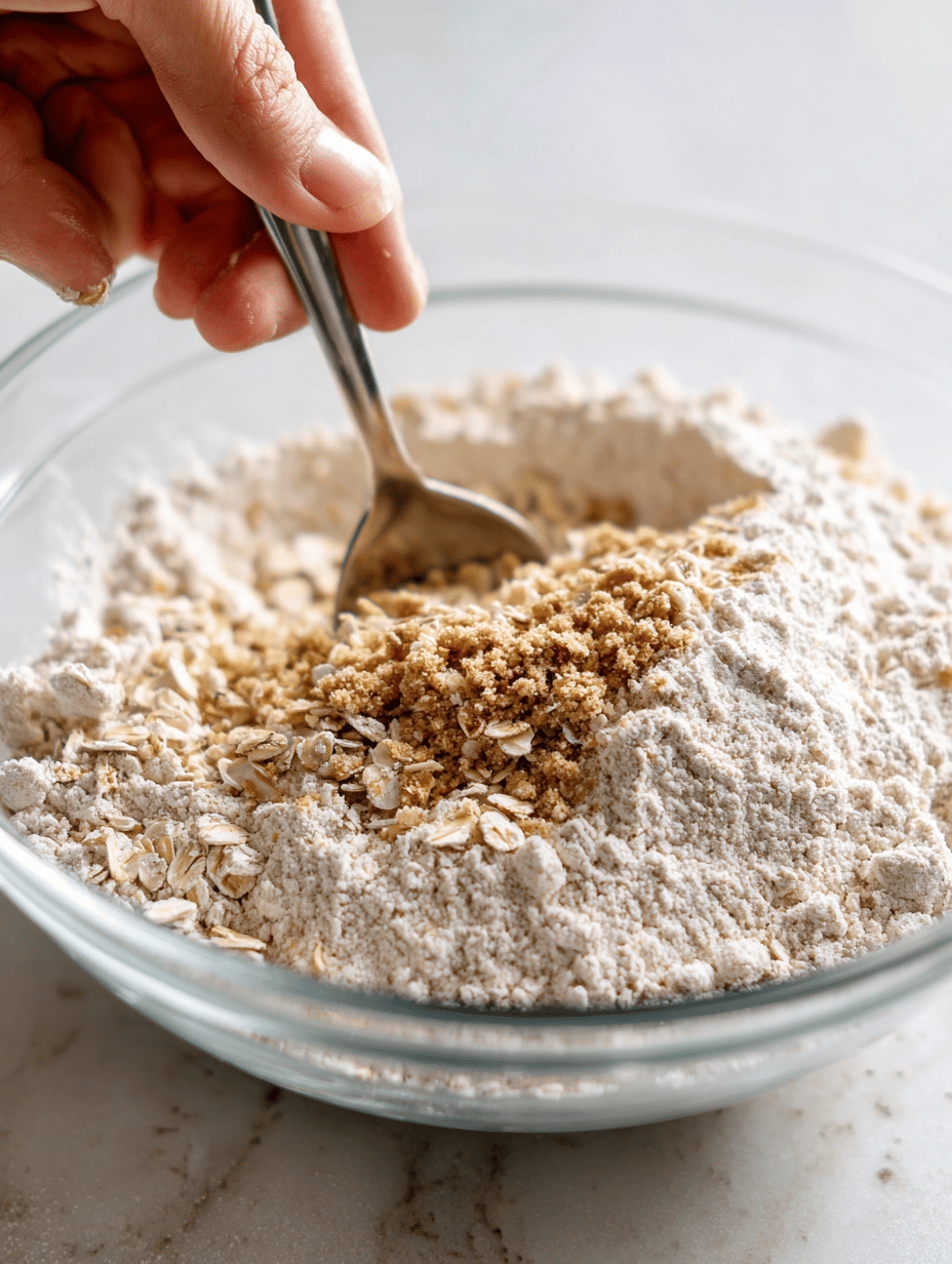 In a mixing bowl, combine the flour, oats, brown sugar, and a pinch of salt. Mix them together until evenly distributed, creating the base for your crumble topping.