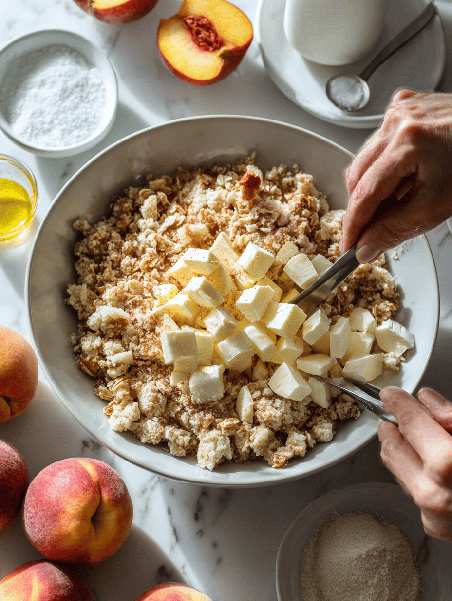 Add the cold, cubed butter to the dry mixture. Use a pastry cutter or your fingers to work the butter into the mixture until it resembles coarse crumbs, with some pea-sized bits remaining. This is what gives the topping its flaky texture.