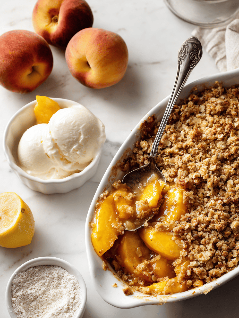 Serve the warm peach crumble with a scoop of vanilla ice cream or a dollop of whipped cream for extra indulgence. Enjoy the comforting, summery flavors in every spoonful.