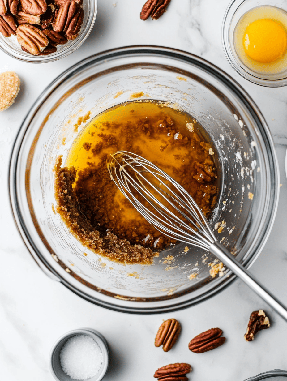 Whisk together the corn syrup, brown sugar, beaten eggs, vanilla extract, and salt in a mixing bowl until well combined.