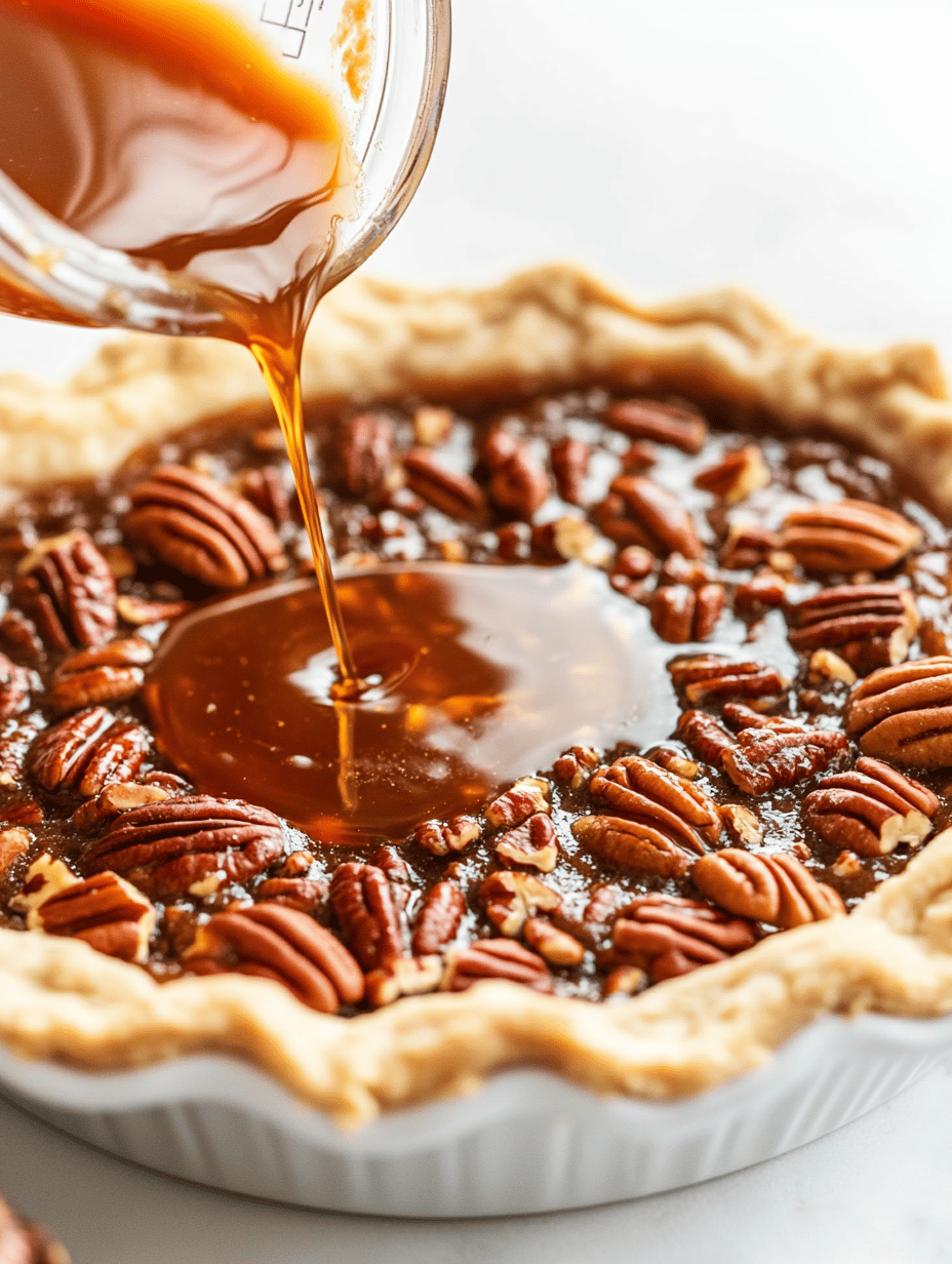Pour the pecan filling into the prepared pie crust, smoothing the top with a spatula.