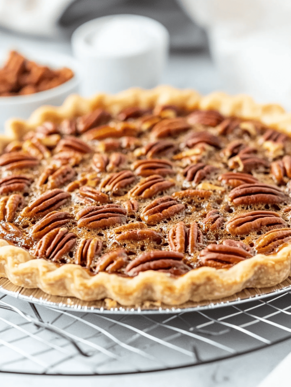A classic pecan pie featuring a rich, gooey filling surrounded by crunchy, buttery pecans in a flaky crust.