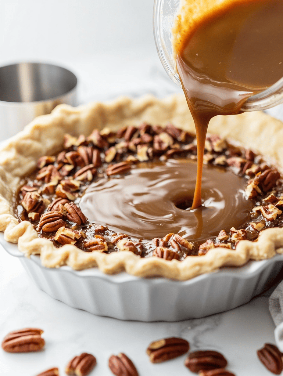 Pour the pecan mixture into the prepared pie crust, spreading it evenly.