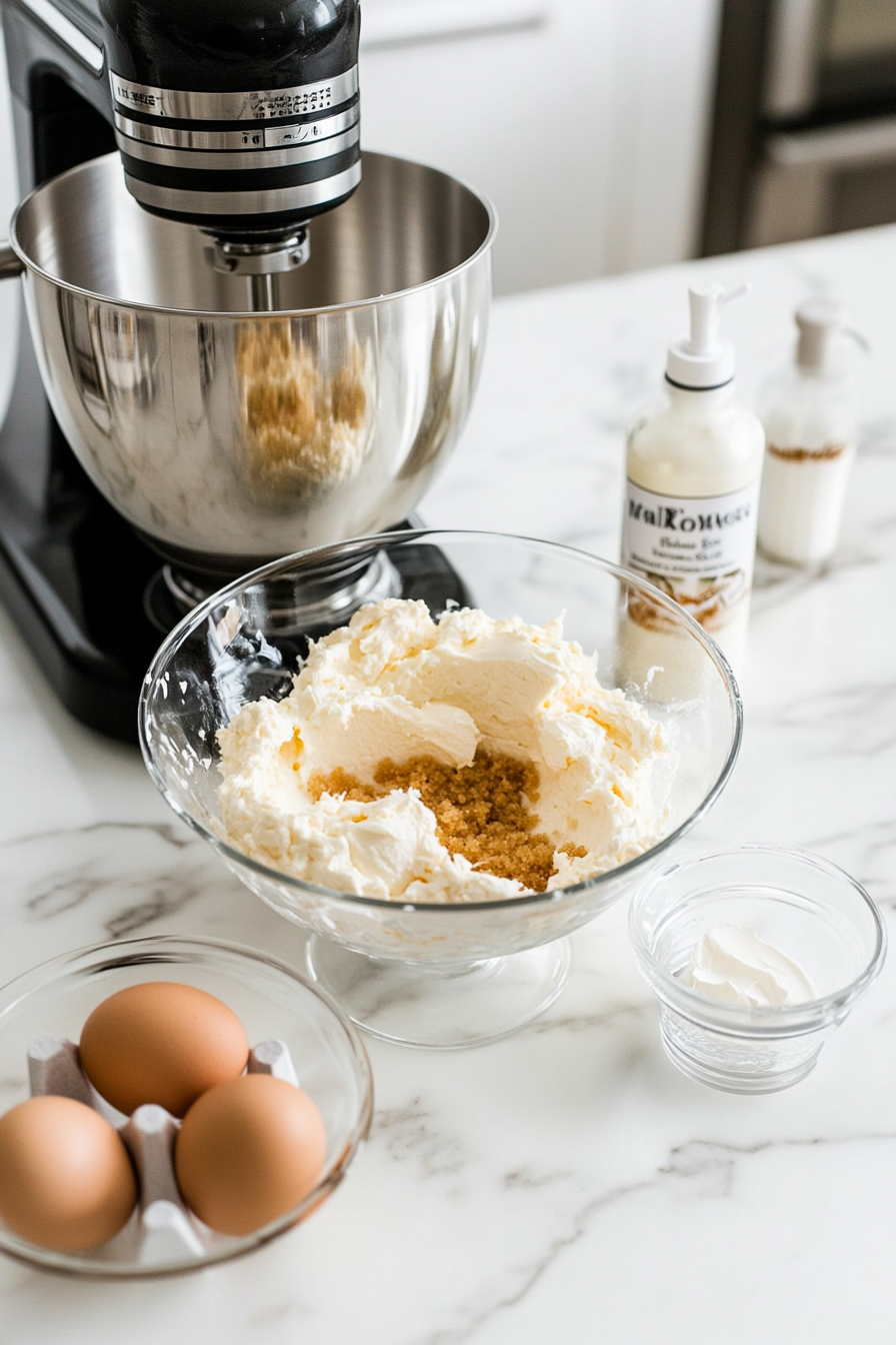 Make Cheesecake Filling: Beat cream cheese and sugar, add eggs one at a time, then mix in vanilla, sour cream, and optional rum.
