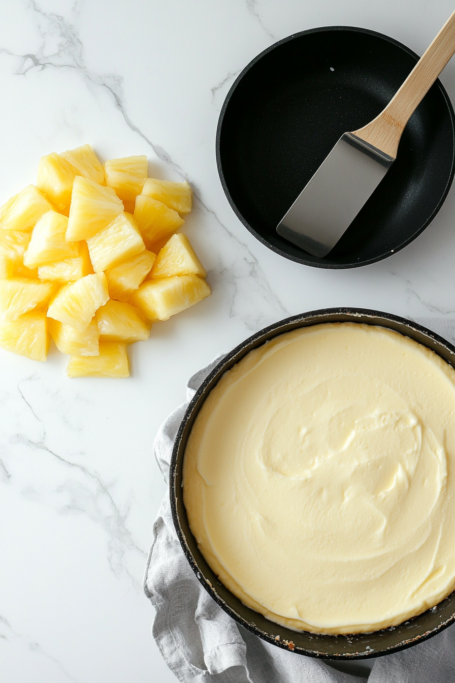 Assemble Cheesecake: Layer half the cheesecake batter, pineapple filling, and remaining batter in the crust.