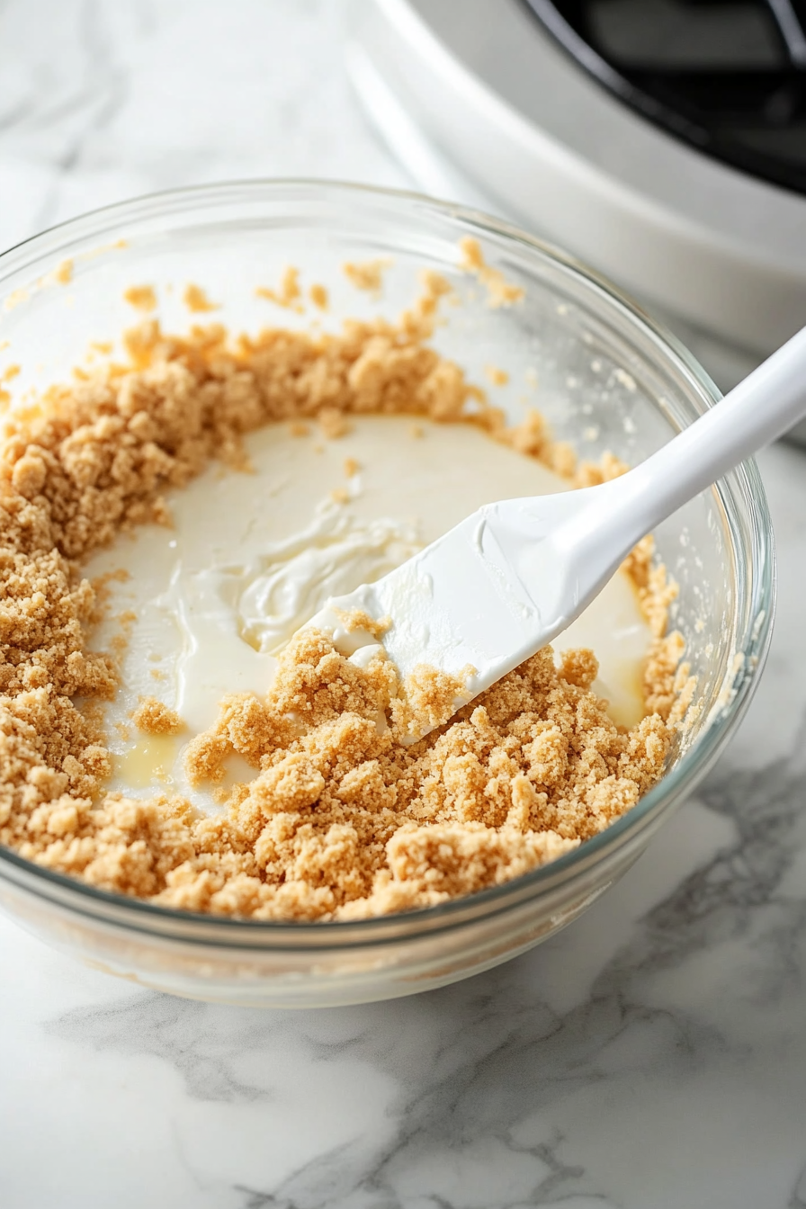 Prepare Crust: Preheat oven to 350°F, mix graham crumbs with melted butter, press into a springform pan, and bake for 10 minutes.