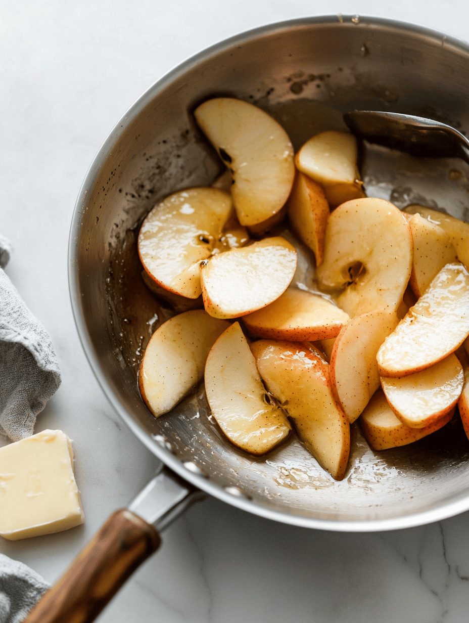 Peel, core, and thinly slice the apples. Sauté the apple slices in a tablespoon of butter over medium heat until they are golden brown and caramelized, about 8-10 minutes. Set aside to cool slightly.