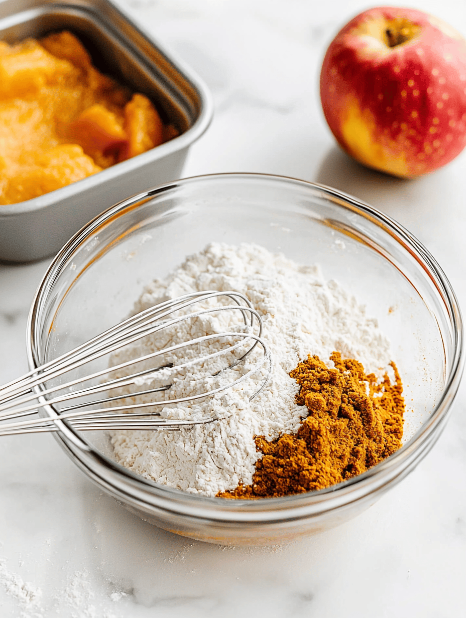 Preheat your oven to 350°F (175°C) and grease a standard loaf pan. In a large mixing bowl, whisk together the flour, sugar, spices, and baking soda until well combined.