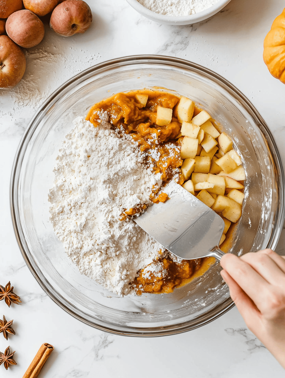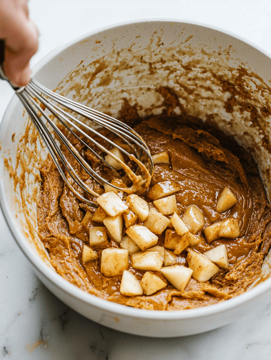 Gently fold in the sautéed apple slices to evenly distribute caramelized bits throughout the batter.