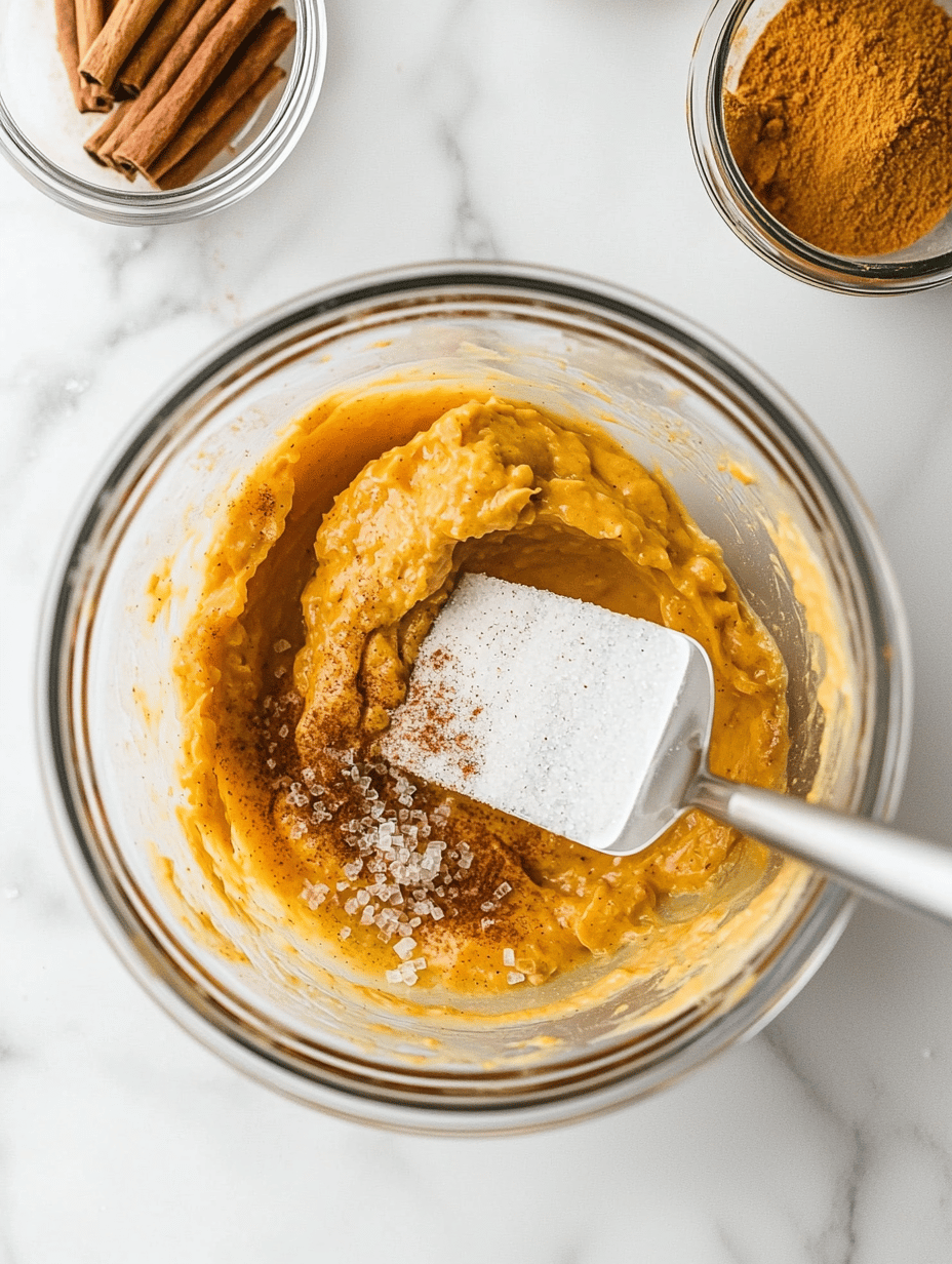 Add the granulated sugar for the filling gradually, mixing until well incorporated. Next, beat in the pumpkin puree along with ground cinnamon, nutmeg, ginger, cloves, and salt until the mixture is smooth and unified.
