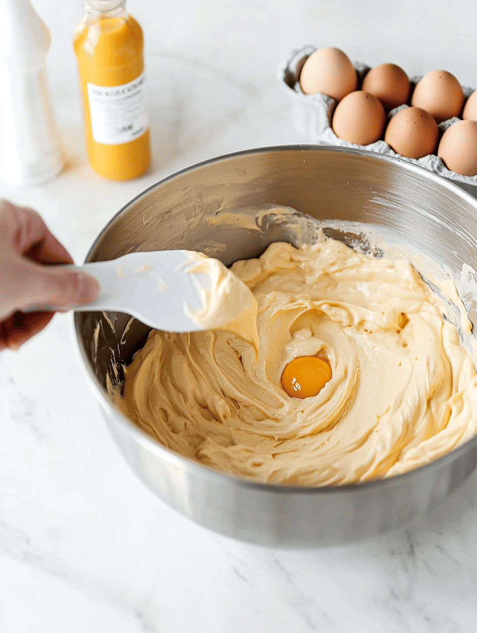 One at a time, add the eggs, beating gently after each addition just until incorporated. The batter should be creamy and slightly thick but pourable.