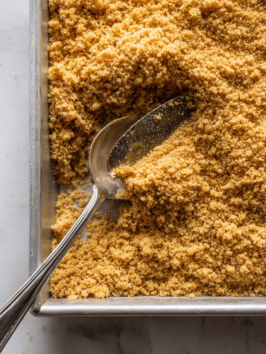 Press the crumb mixture evenly into the bottom of the prepared pan, creating a firm, level crust. Bake for about 10 minutes until fragrant and slightly golden, then remove from the oven and set aside.