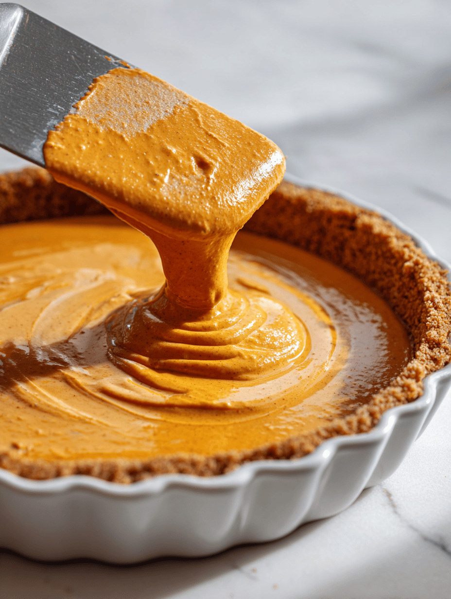 Pour the pumpkin filling over the pre-baked crust, spreading it into an even layer with a spatula. Tap the pan gently on the counter to settle the filling and remove any air bubbles.