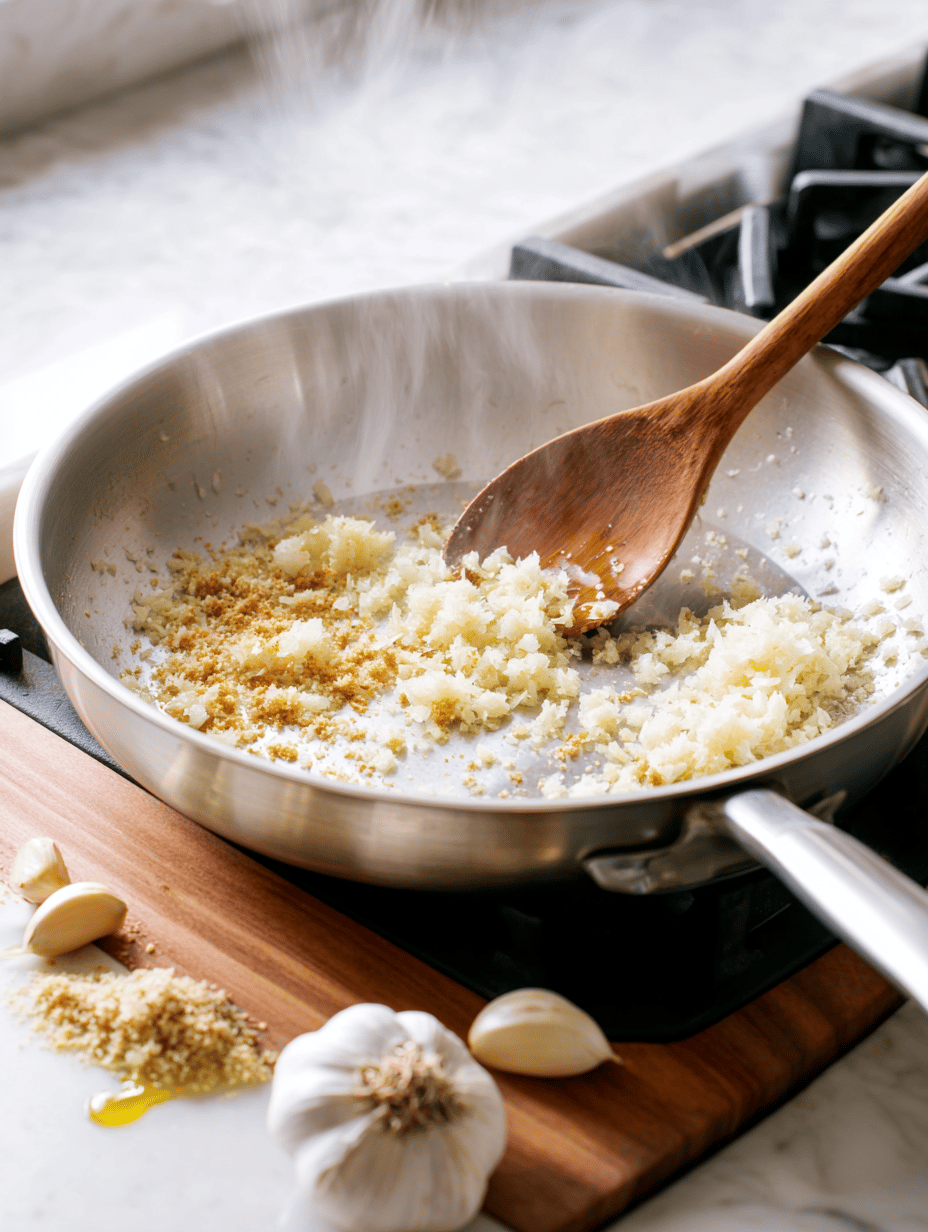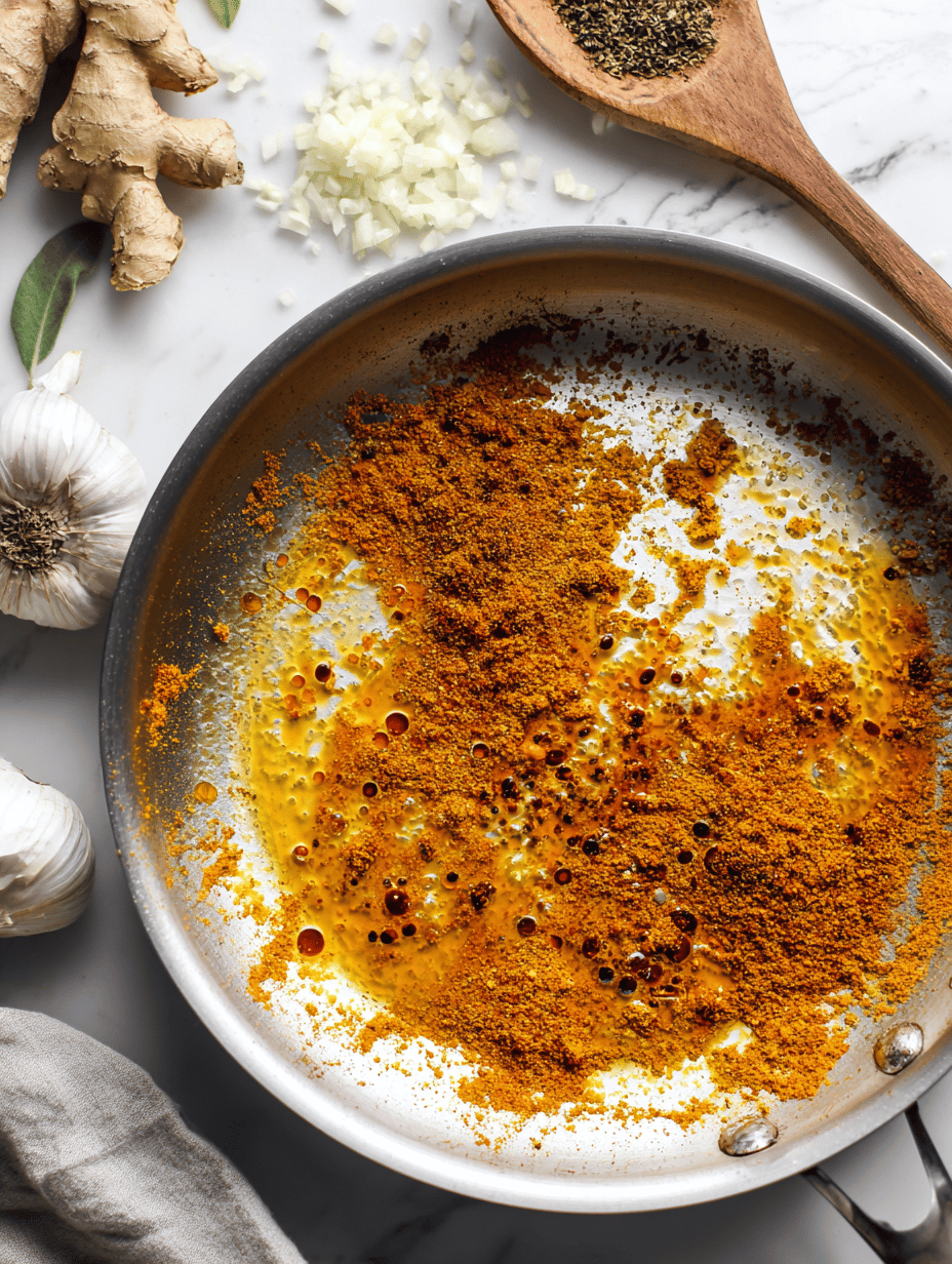 Stir in the minced garlic, grated ginger, and turmeric, cooking for about 1 minute until fragrant. The mixture will become aromatic and slightly darker in color.