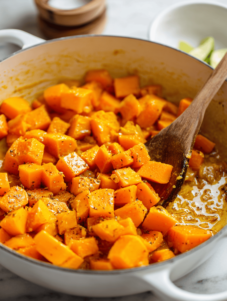 Pour in the can of coconut milk and add a splash of vegetable broth if needed to cover the pumpkin. Bring the mixture to a gentle simmer, watching for small bubbles to form around the edges.