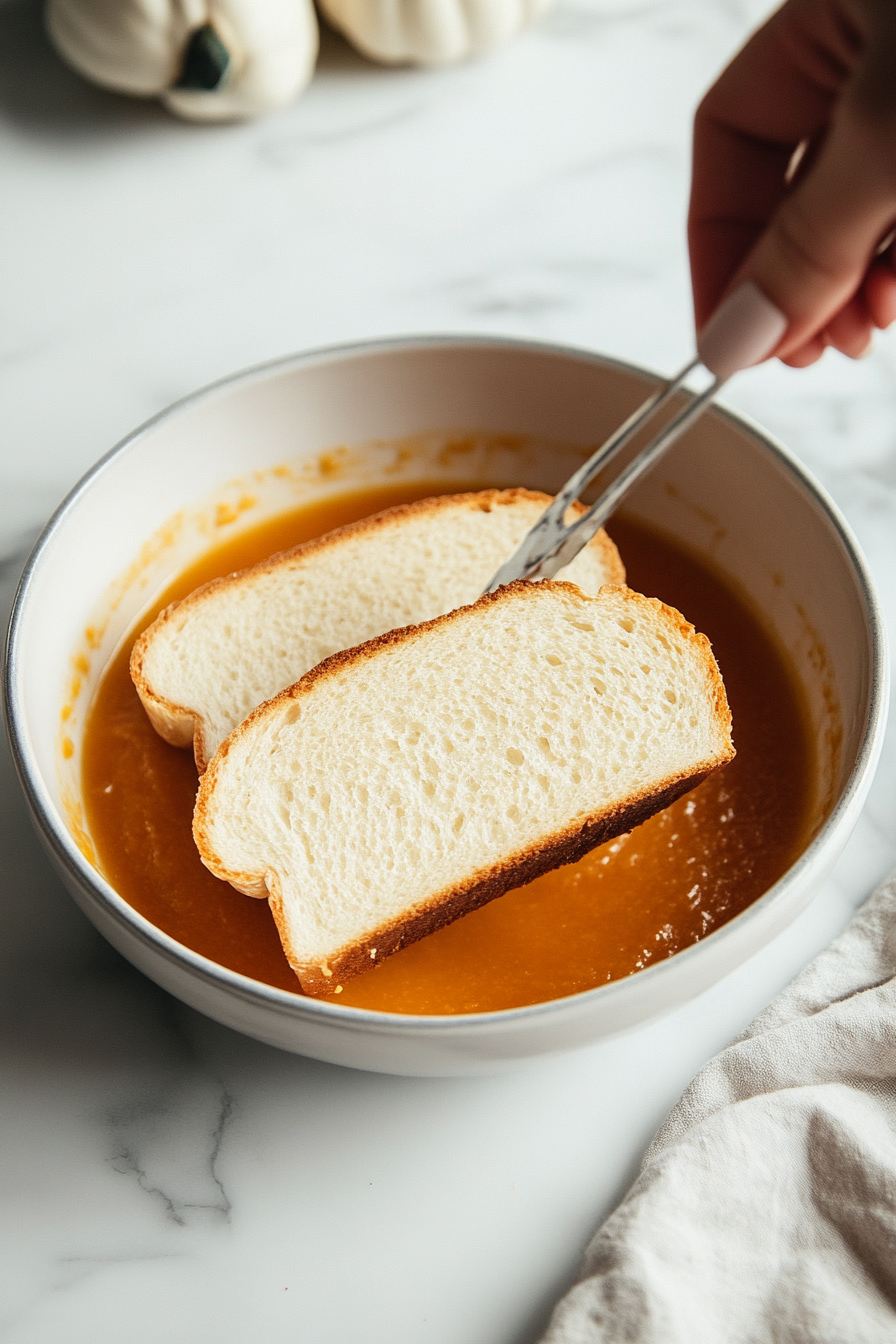 While the butter melts, dip a slice of bread into the pumpkin mixture, coating both sides well.